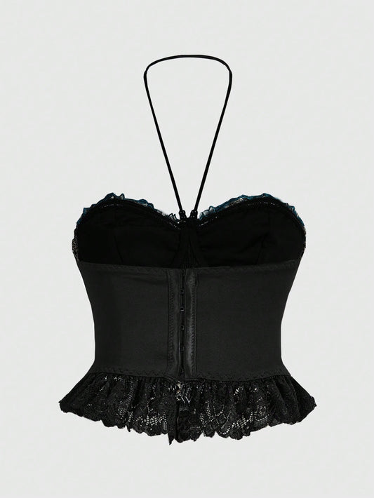 ROMWE Goth Top De Cuello Halter Para Mujer Con Diseño Sexy De Serpiente, Flores Y Encajes Para Vacaciones