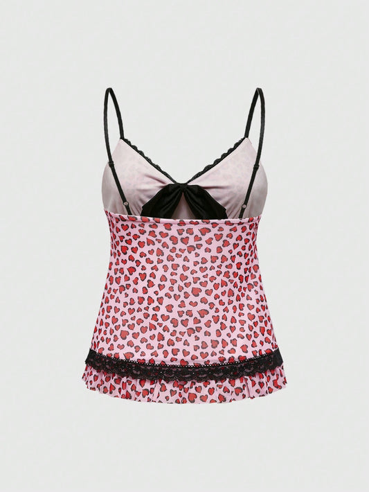 ROMWE J-Fashion Camiseta de tirantes con lazo y estampado de leopardo para mujer, perfecto para el Día de San Valentín
