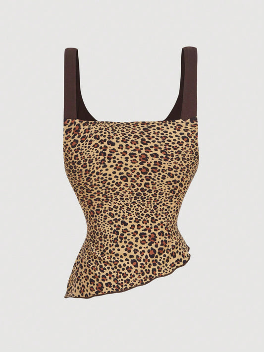 SHEIN MOD Parte superior ajustada de tirantes con cuello en V y ribete de contraste con estampado de leopardo, parte superior con estampado de tigre, parte superior con estampado de leopardo