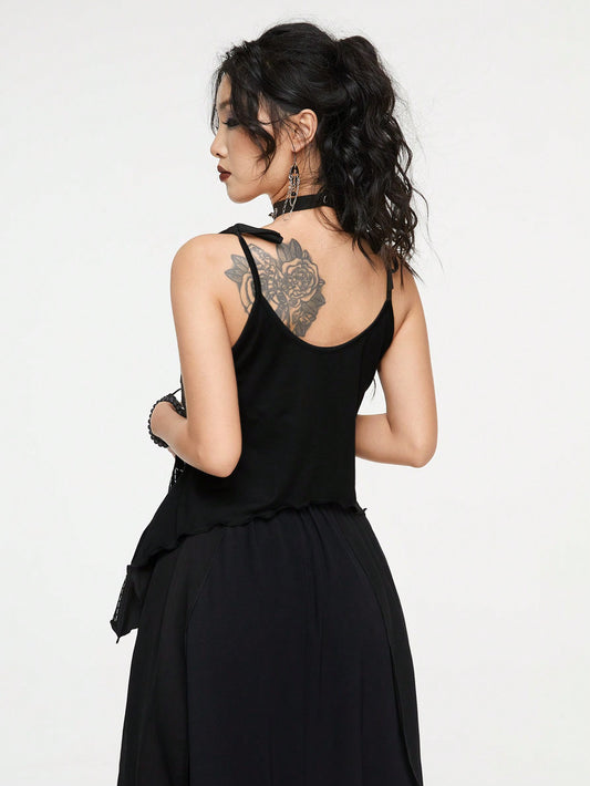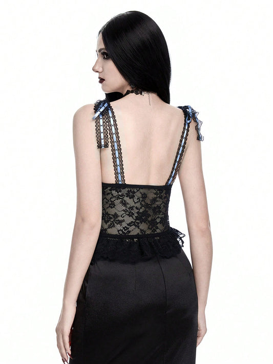 ROMWE Goth Camiseta sin mangas para mujer con tirantes con corbata y bloque de color de tela de encaje decorada con cruz gótica
