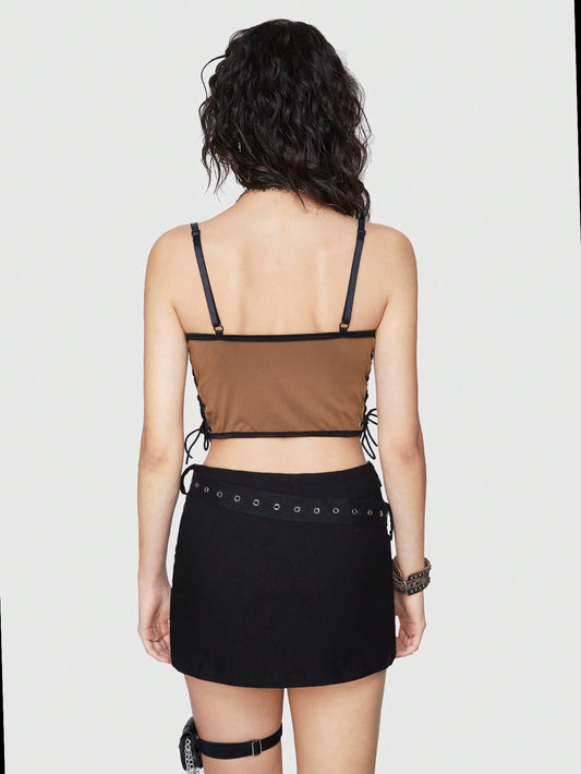 ROMWE Grunge Punk Camiseta sin tirantes con diseño de cordones en el frente y aplicaciones de piel y parches en estilo vintage Y2K para mujeres