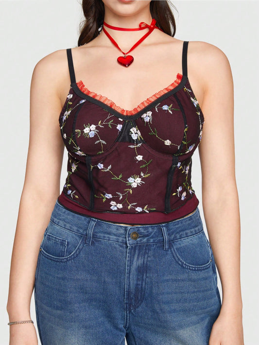 ROMWE Goth Camiseta interior floral y de mariposa bordada con malla de contraste elegante y de talla grande, ideal para verano