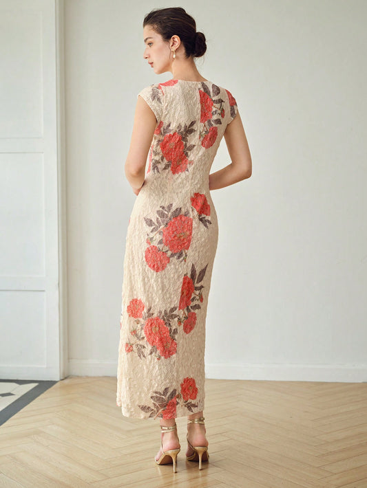 MOTF PREMIUM VESTIDO BOMBACHO CON ESTAMPADO FLORAL, ESCOTE EN V Y CUBIERTA DE ENCAJE