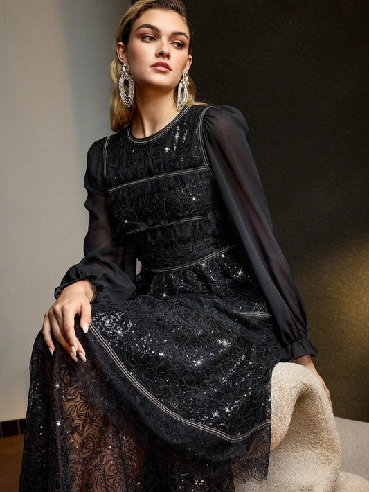 MOTF PREMIUM Vestido largo con manga acampanada, tela de malla bordada con lentejuelas y dobladillo en capas