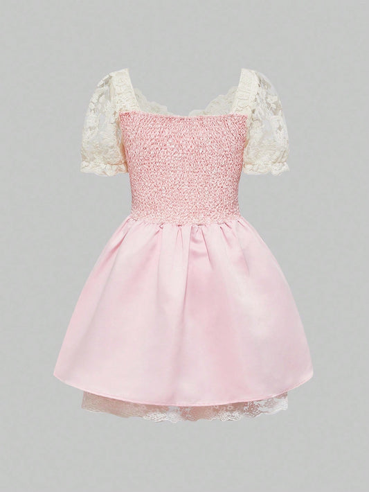 ROMWE ROMWE EDITION Vestido mini de mujer con falda con volumen, estilo vintage palaciego, romantico, de encaje y parches, con decoración de cadena de perlas