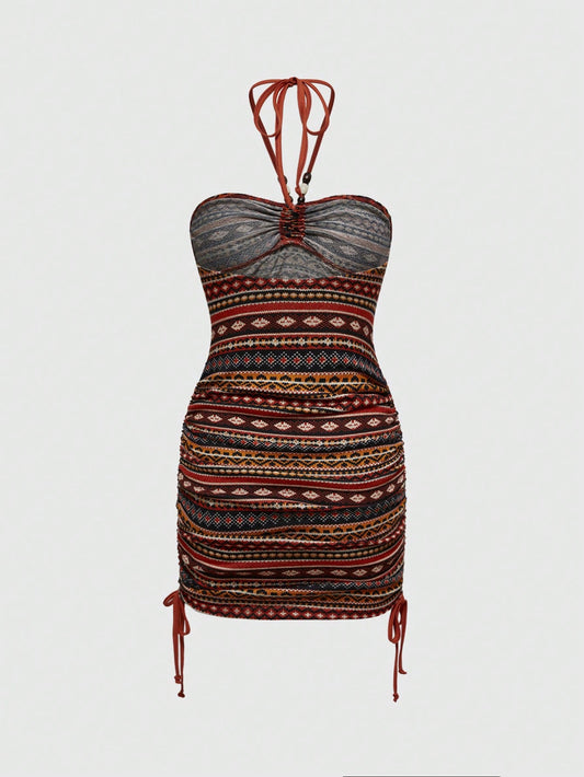 ROMWE Hippie Vestido con cordón para el cuello con estampado de tótem retro hippie para mujeres