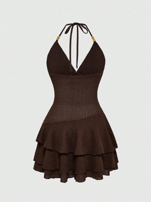 ROMWE Hippie Vestido informal mini con cuello halter, bajo con volantes, bordado con floral y tótem estilo hippie Y2K para mujeres