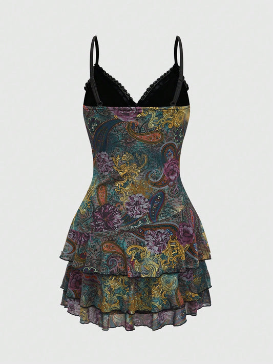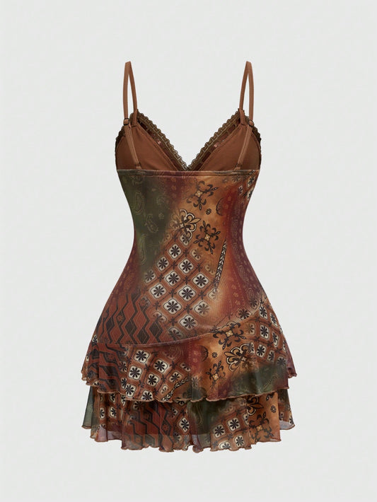 ROMWE Hippie Vestido mini con estampado de paisley con volantes, encaje y cinta estilo vintage hippie retro para mujeres