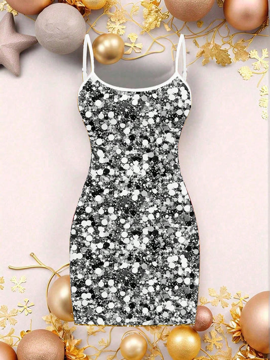 SHEIN EZwear Vestido corto de fiesta casual con tirantes finos y diseño estampado con lentejuelas plateadas, ajuste ceñido para mujer