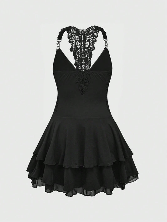 ROMWE Avant Vestido con escote halter de gasa y diseño sexy con espalda descubierta, falda con múltiples volantes en el bajo, estilo Y2K