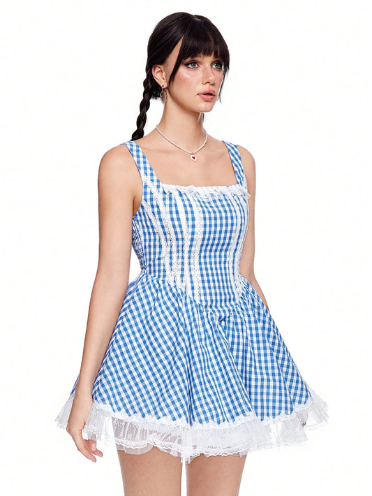 ROMWE Kawaii Vestido de disfraz de Halloween con parches de encaje y tirantes anchos para mujer