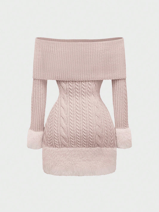 ROMWE Kawaii Vestido de suéter de mujer estilo Himekaji con parches de piel sintética, pompones y decoración colgante, con hombros descubiertos para el Día de San Valentín