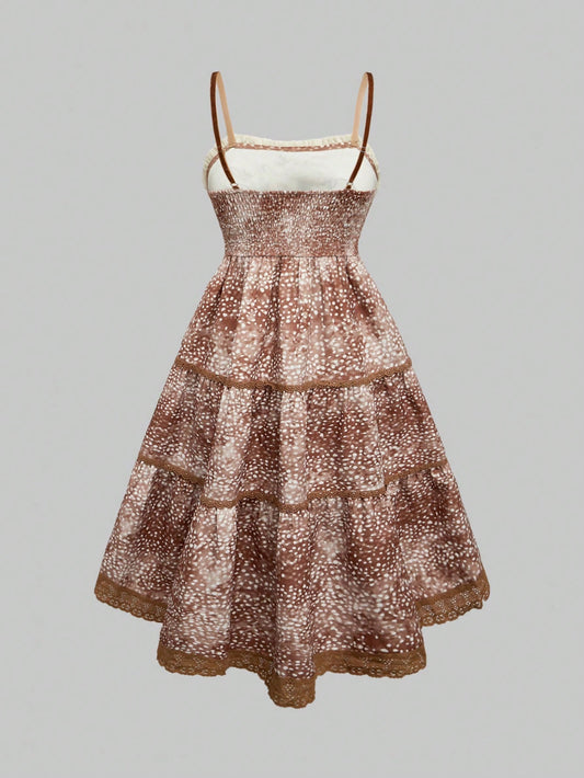 ROMWE Kawaii Vestido de tirantes finos con estilo romántico y campestre para niñas, de diseño de retazos con estampado floral diminuto y volante con encaje en el bajo