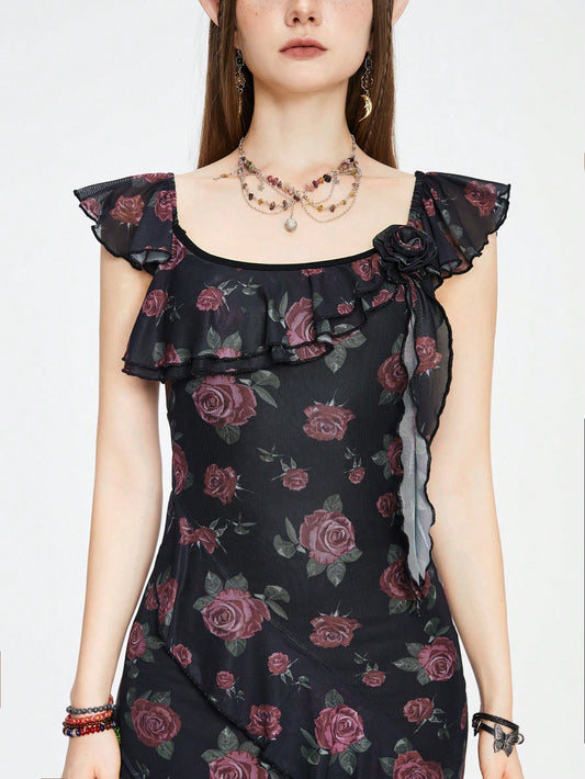 ROMWE Fairycore Vestido vintage romántico para mujer con dobladillo asimétrico y estampado de rosas