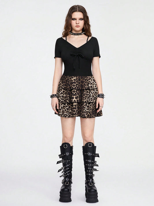 ROMWE Kawaii Vestido de mujer con escote en V, estampado de leopardo, empalmado y con dobladillo con volantes