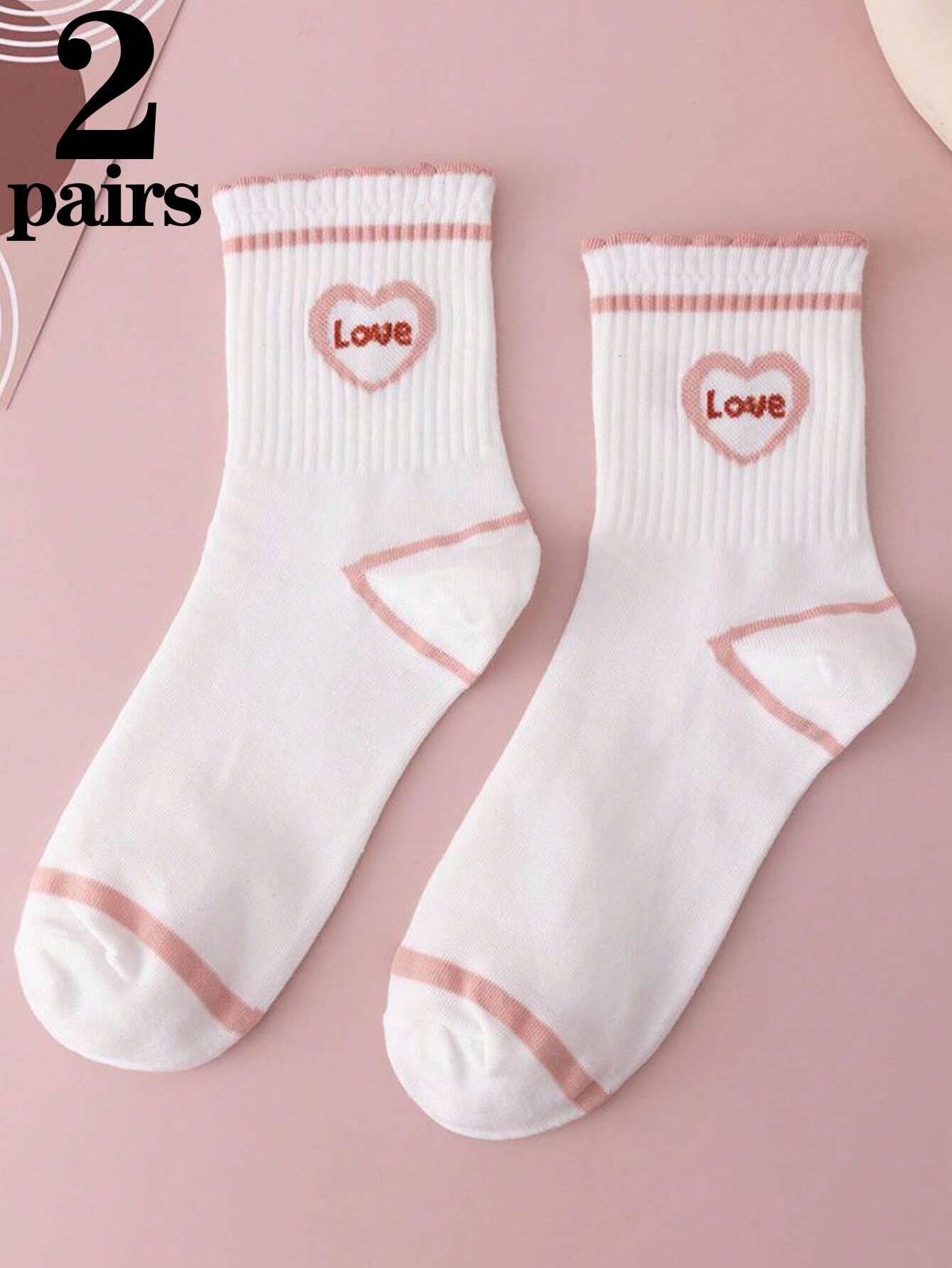 2 pares de calcetines blancos para mujer con bordes rosas y diseño de corazón, de moda y cómodos para uso diario