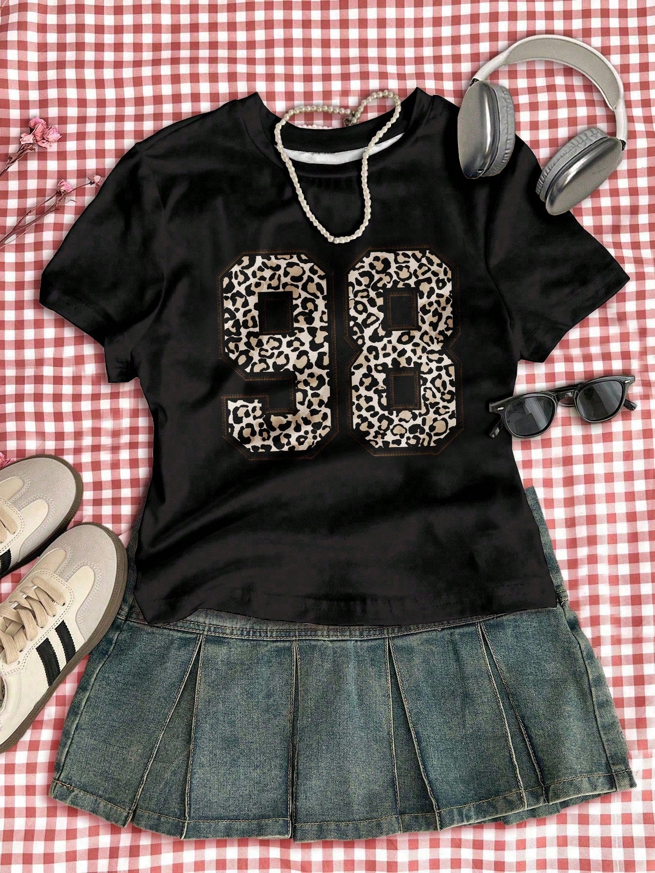 Attitoon Camiseta de mujer de cuello redondo de manga corta y ajuste ceñido con estampado numérico 95 de estampado de leopardo, adecuada para verano, aeropuerto, ropa urbana, Y2K, vuelta al colegio