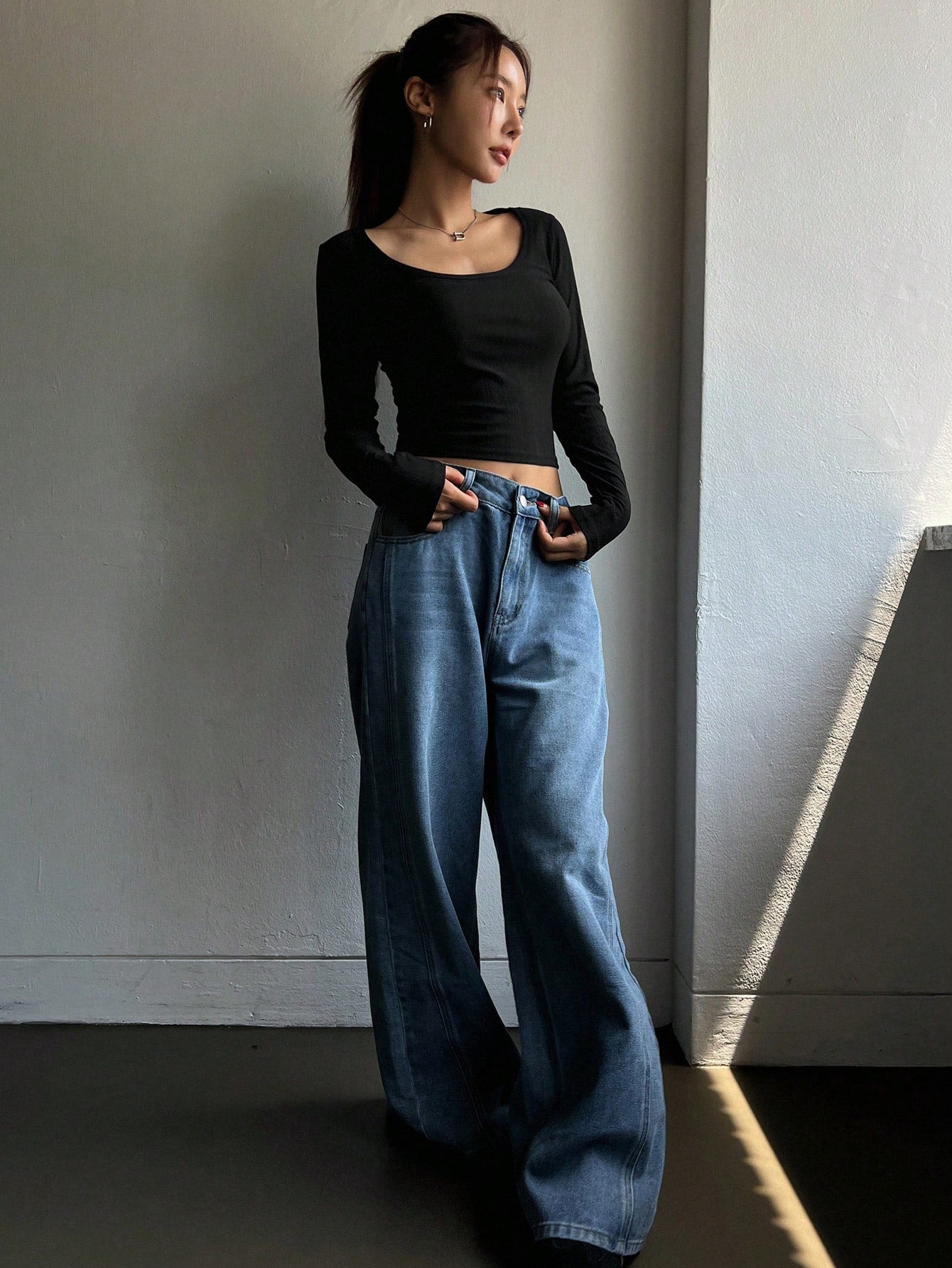 DAZY Camiseta ajustada de cuello redondo para mujer, nueva colección de otoño de blusas de manga larga para mujer