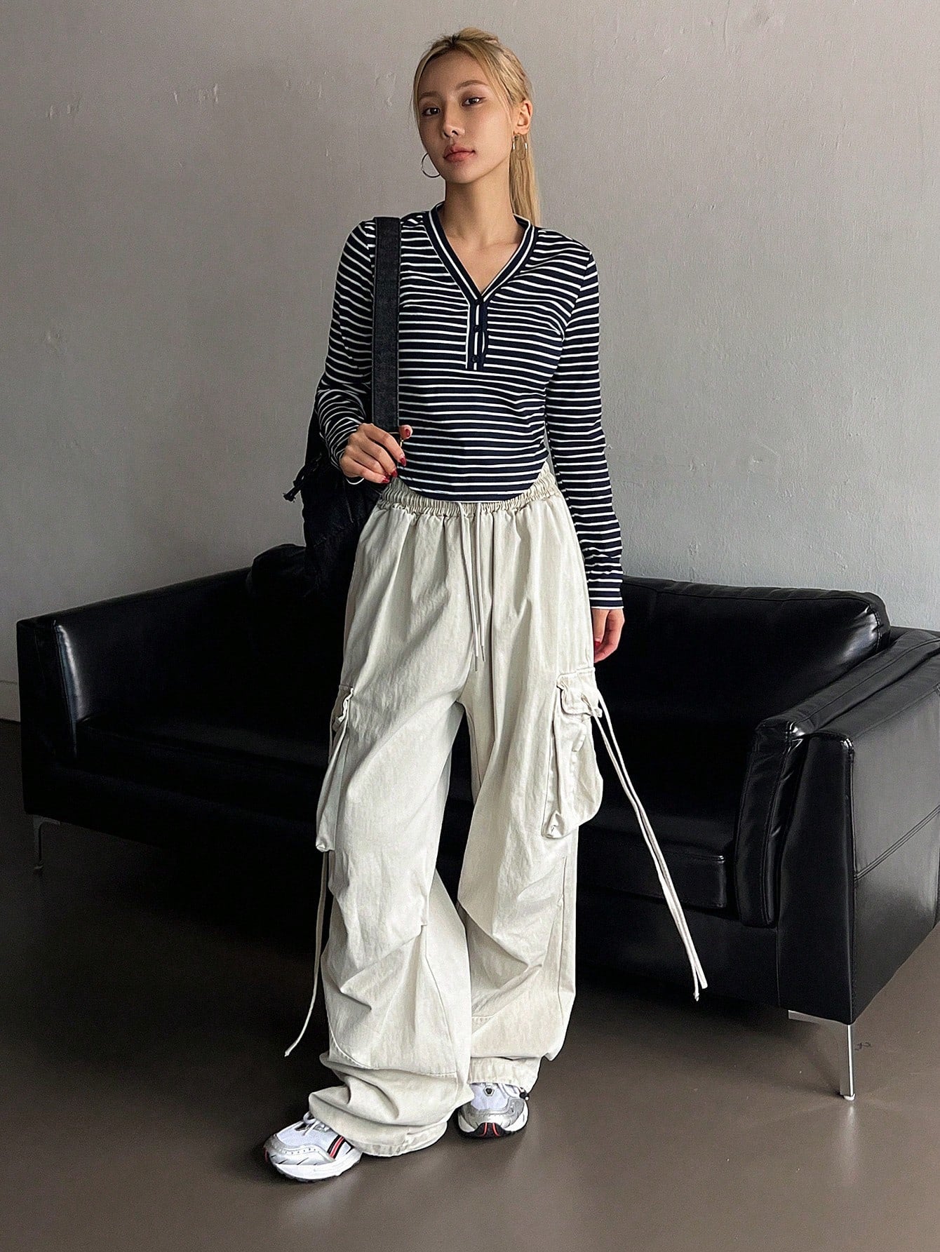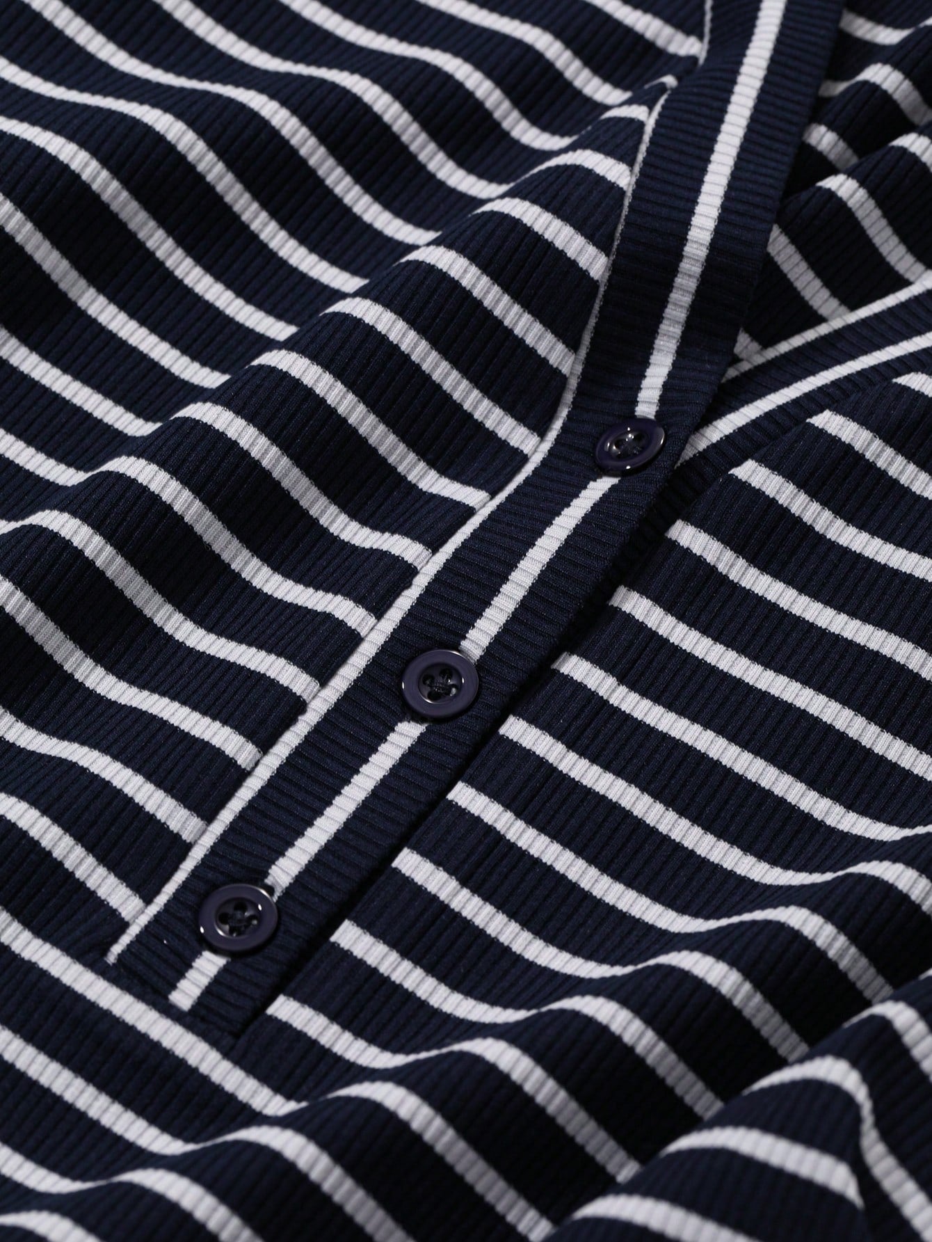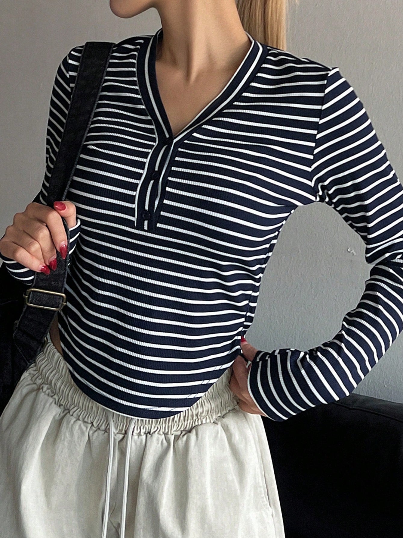 DAZY Camiseta casual de manga larga con cuello en V y rayas, ajuste ceñido, ropa de otoño para mujer