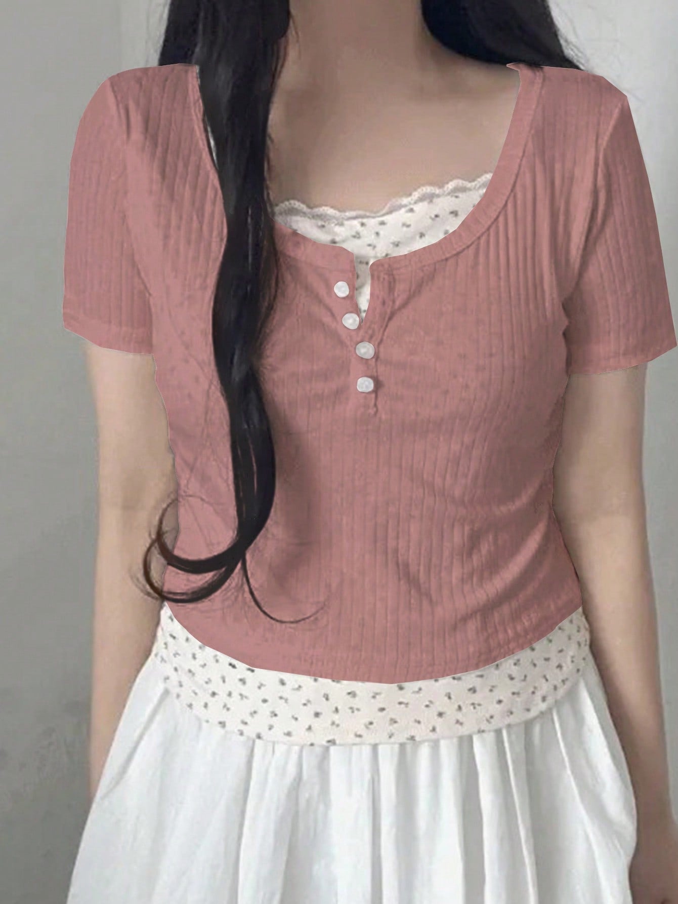 DAZY Camiseta de manga corta ajustada con efecto de empalme 2 en 1 para mujer, color blanco, tops de estilo universitario para primavera/verano