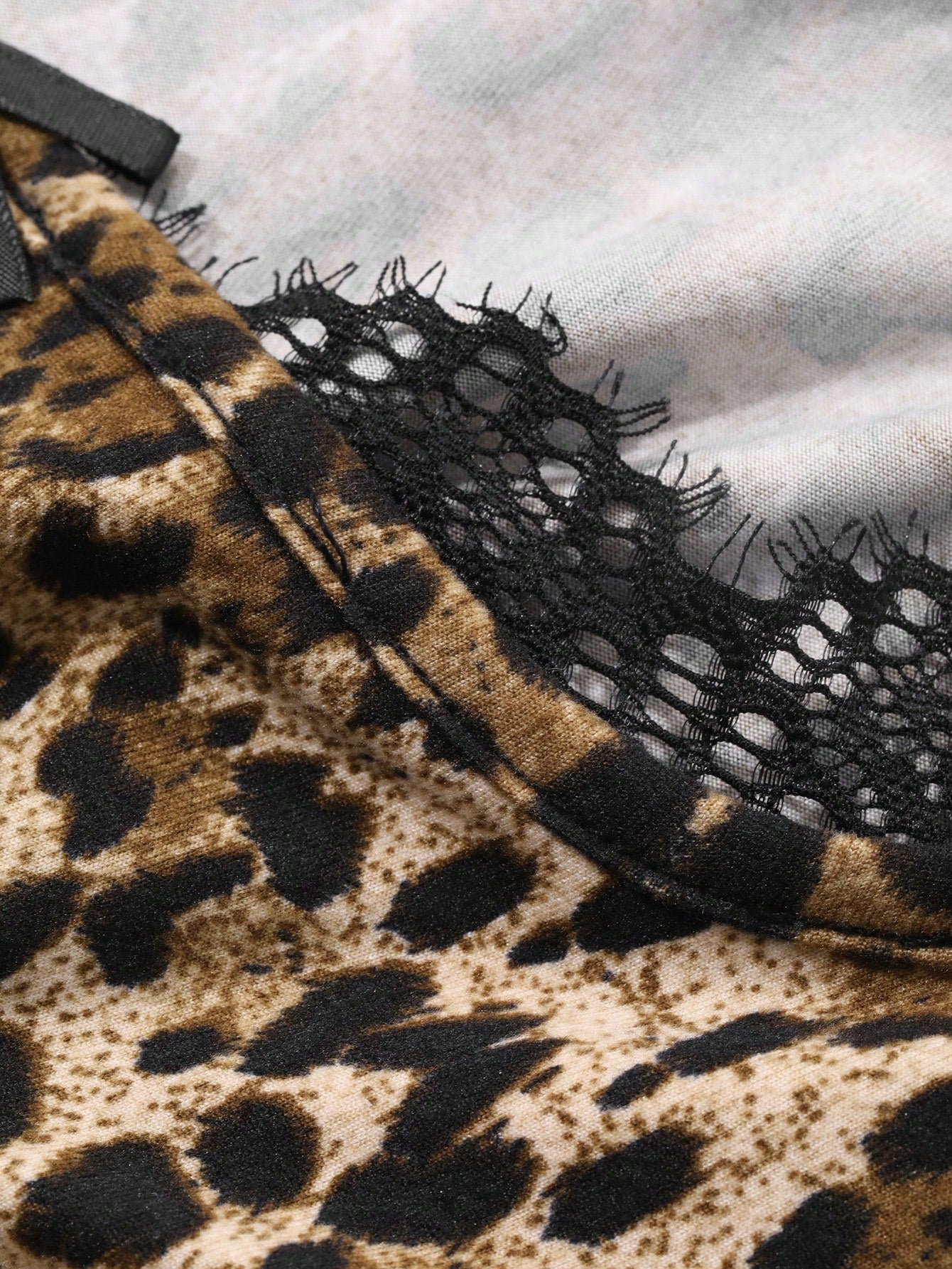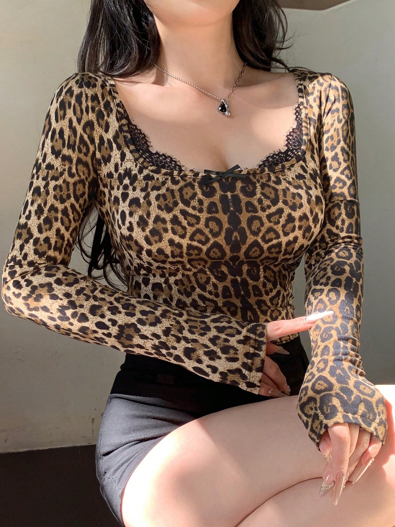 DAZY Camiseta de manga larga ajustada con encaje y estampado de leopardo, ropa de otoño para mujer