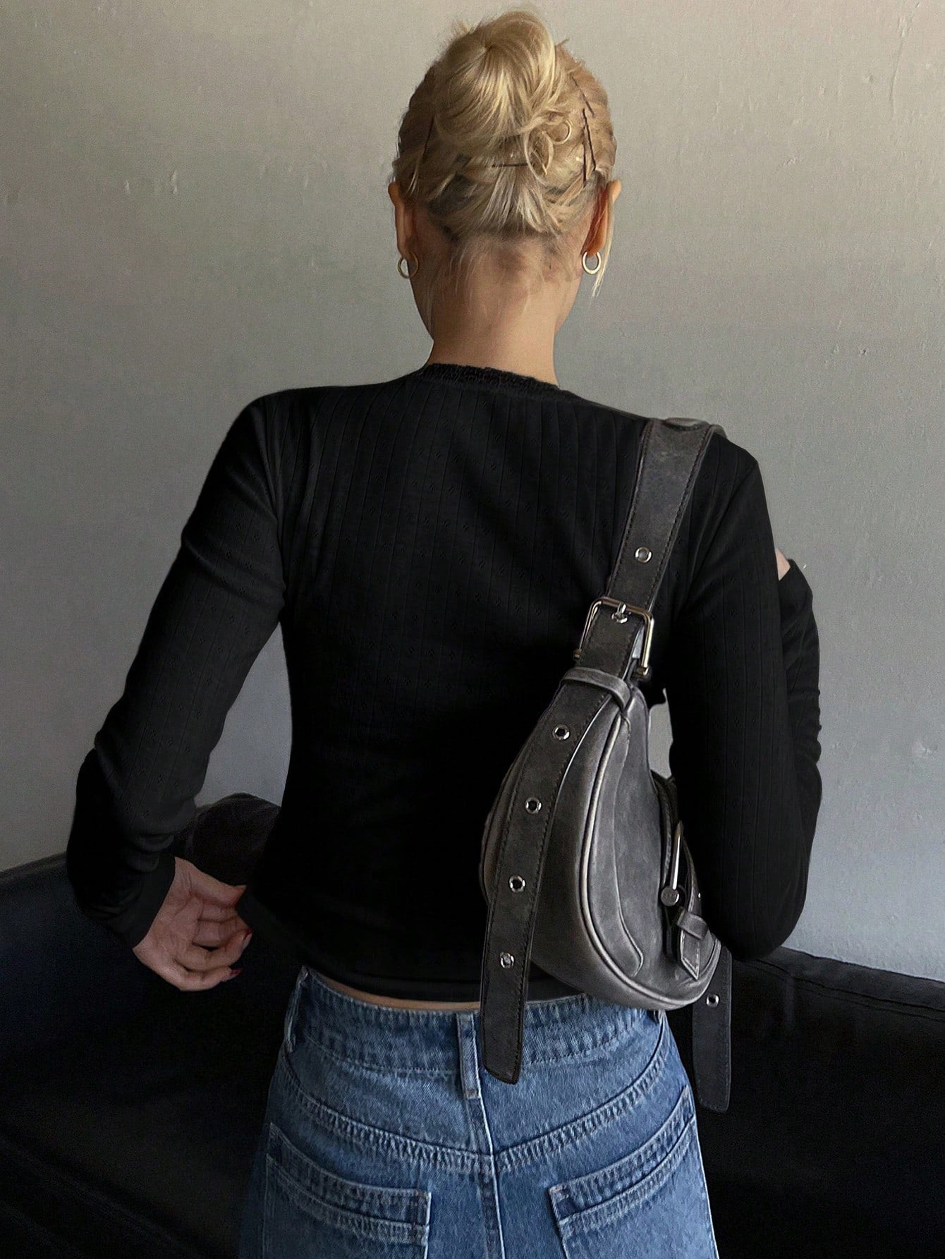 DAZY Camiseta de manga larga de ajuste ceñido con parches de encaje para mujer, ropa de otoño