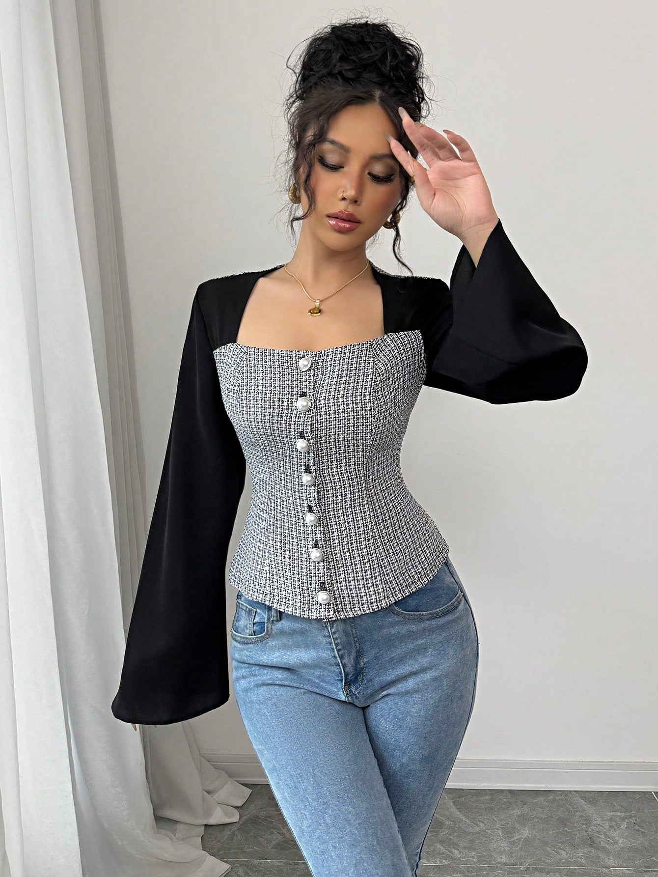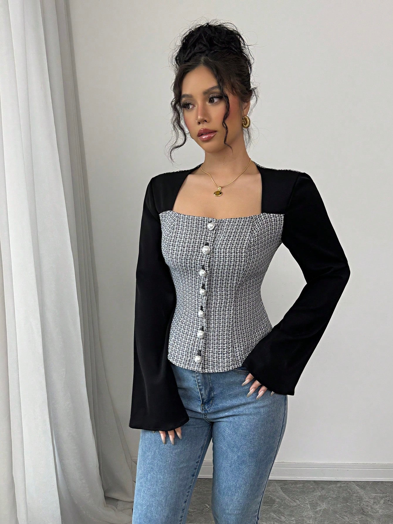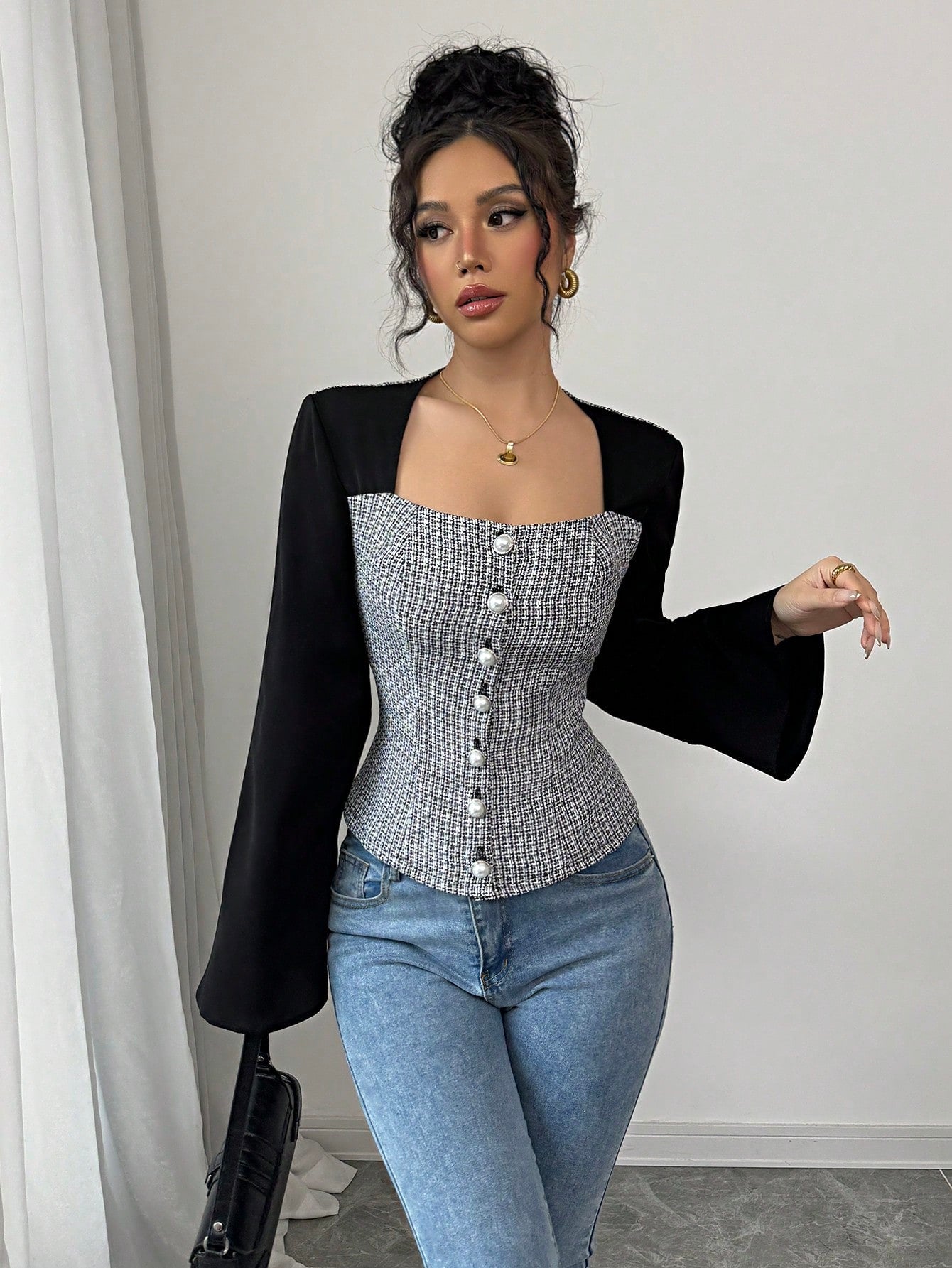 Elenzga Camisa de mujer elegante de manga acampanada con cuello cuadrado y bloque de color negro