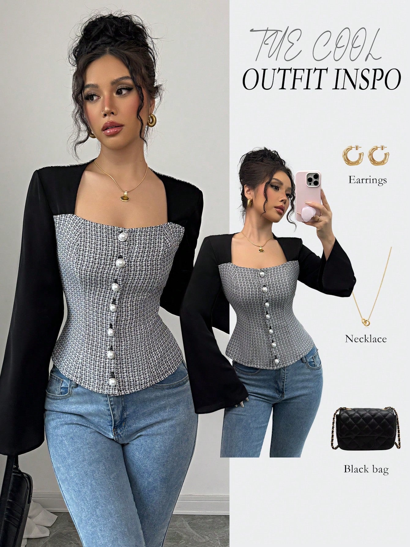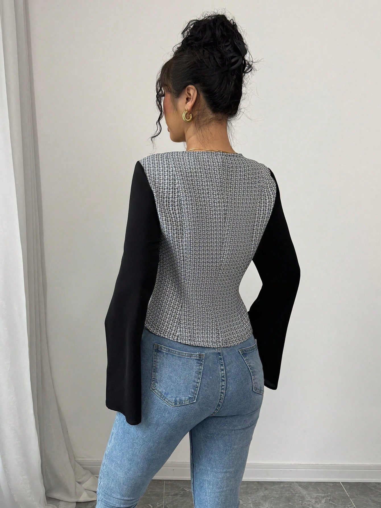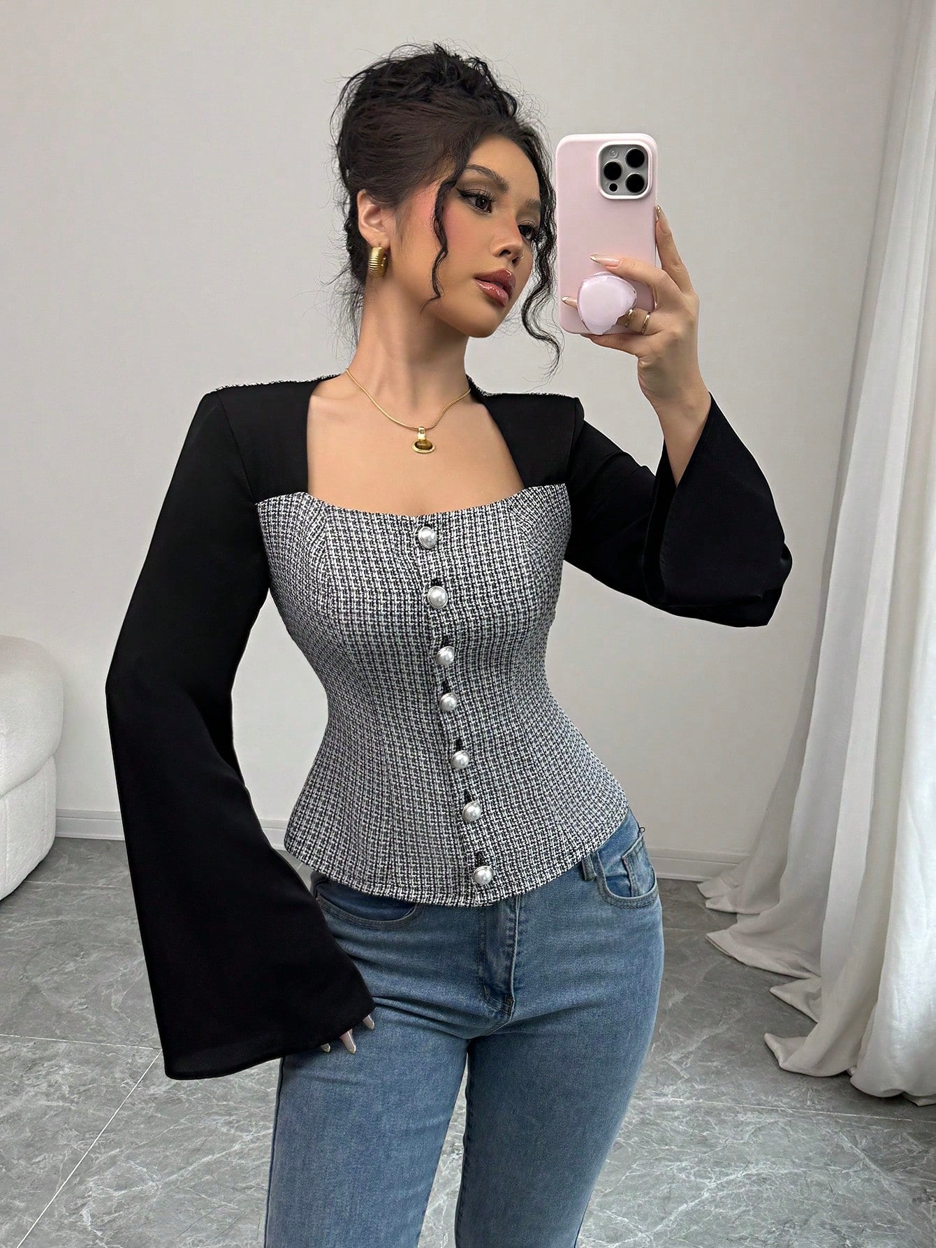 Elenzga Camisa de mujer elegante de manga acampanada con cuello cuadrado y bloque de color negro