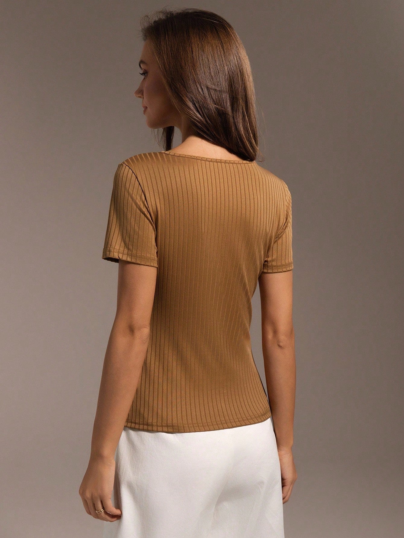 Hanevo Camiseta casual de verano para mujer de unicolor, cuello en V, abotonada, de manga corta