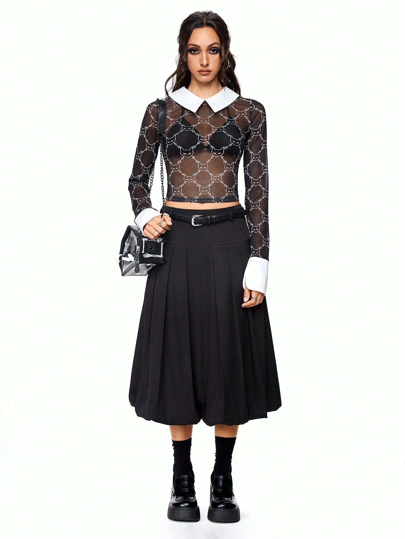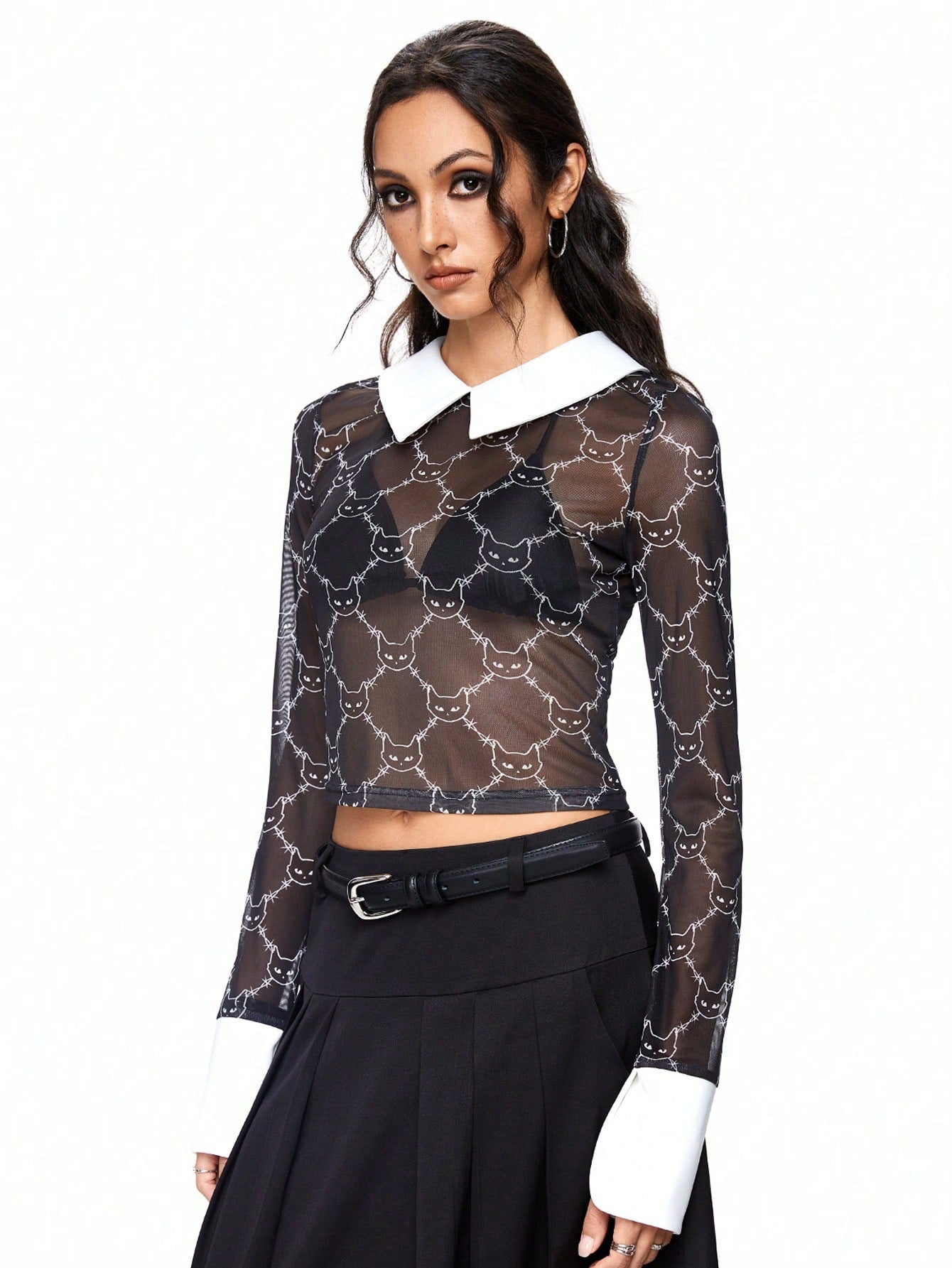 ROMWE Academia Blusa de mujer con cuello polo, bloques de color transparentes con estampado digital de cabeza de gato y espinas, uso escolar