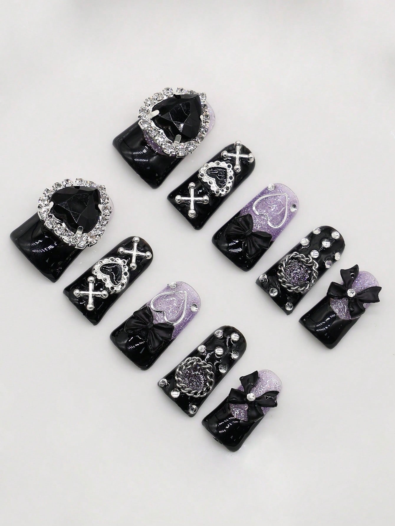 ROMWE Anime 10 piezas de uñas postizas de alta calidad con decoración de lazo y corazón en estilo gótico + 3 piezas de adhesivo doble cara, pegatinas decorativas de uñas con brillo