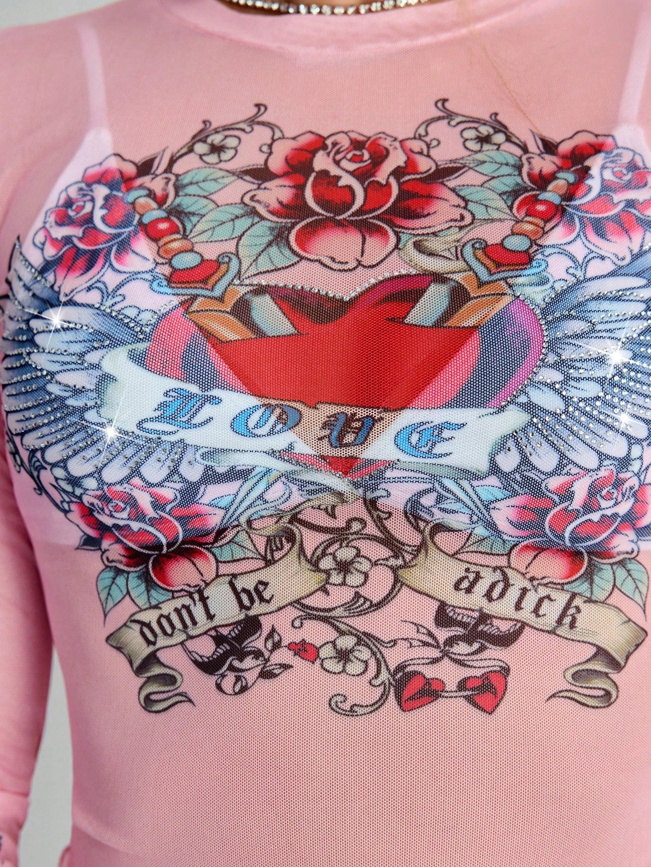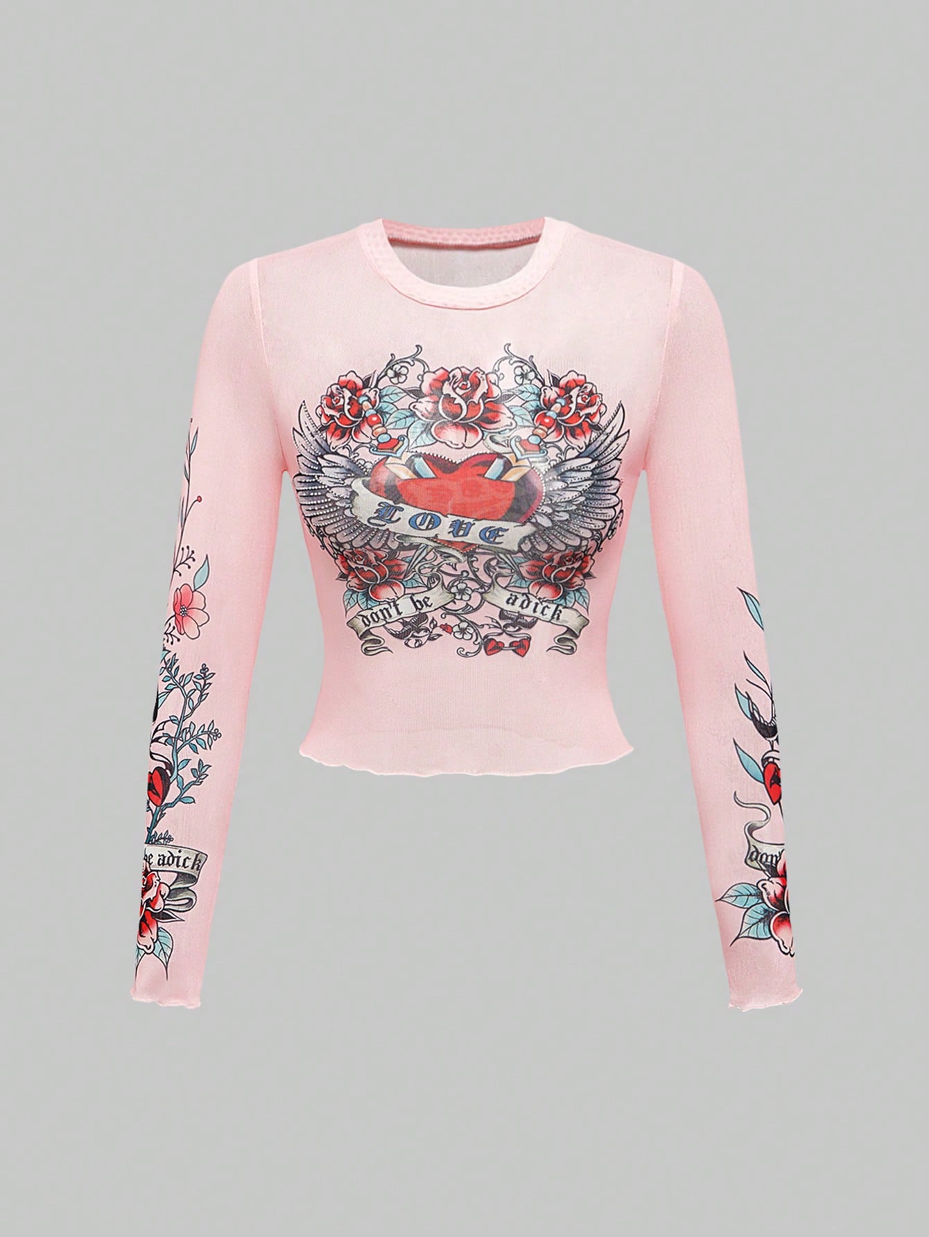 ROMWE Avant Blusa de manga larga con cuello redondo y estampado minimalista para mujer