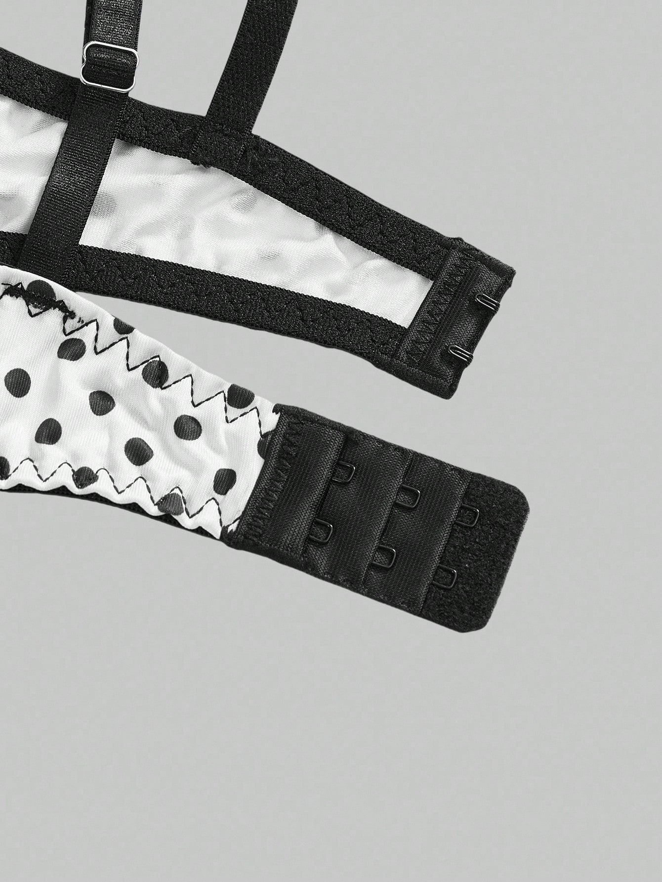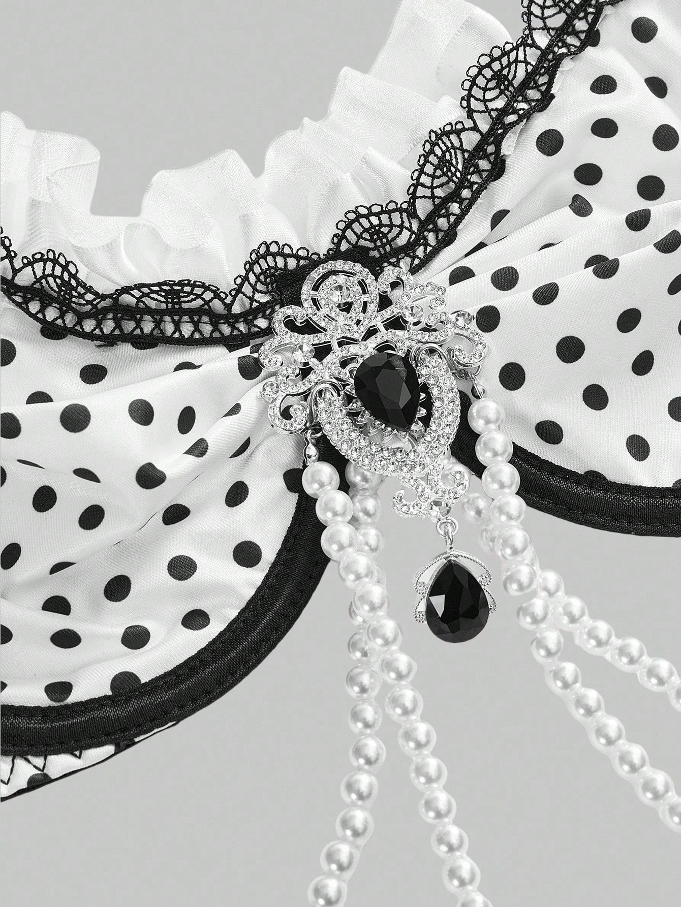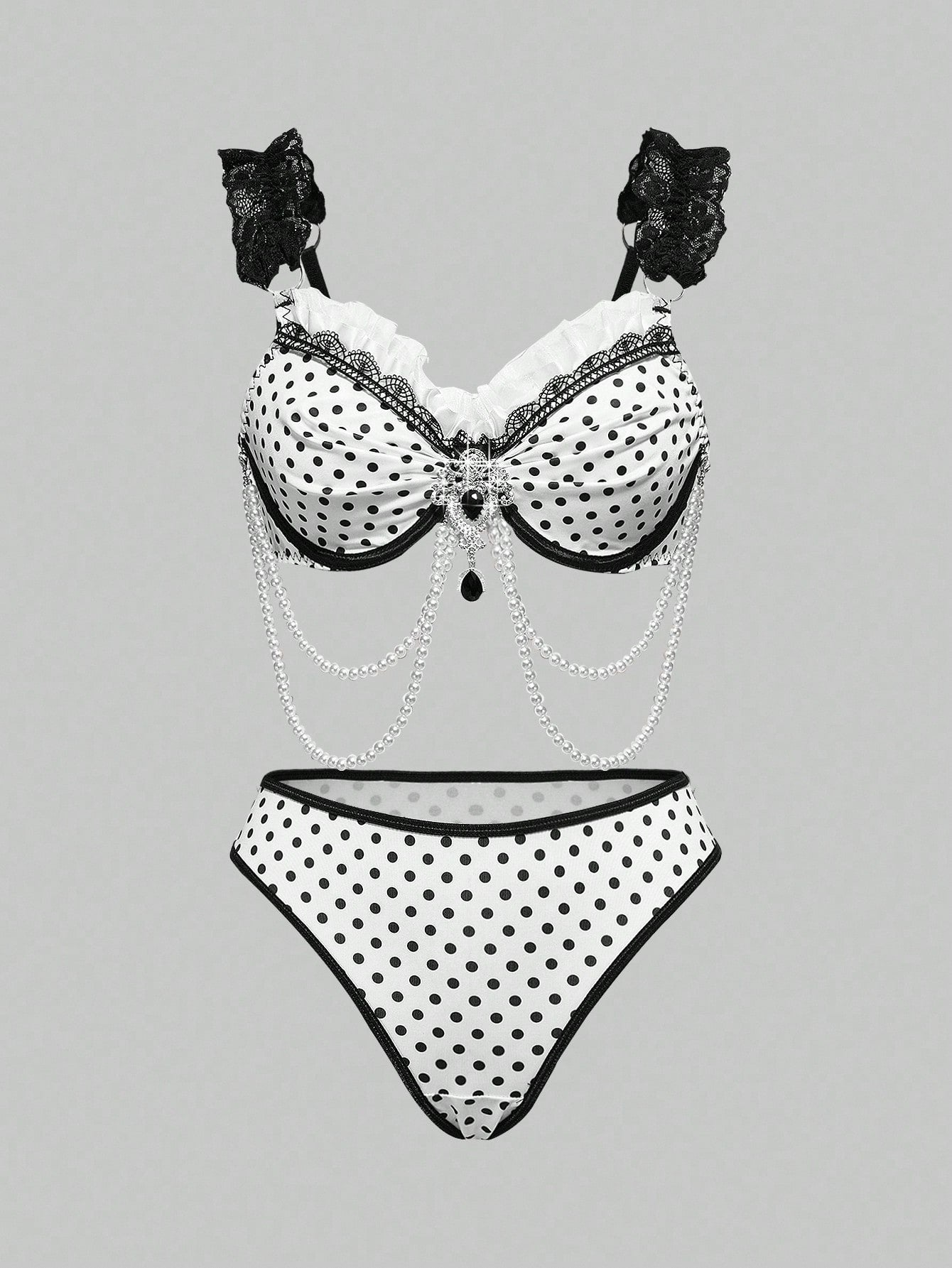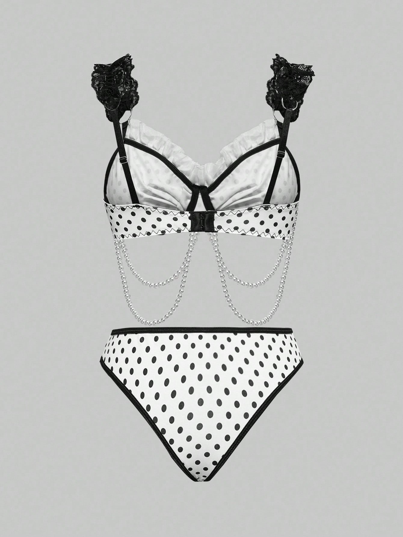 ROMWE Avant Conjunto de lencería sexy de corpiño con aros, encaje y cadena de perlas con diseño de lunares, hecho a mano y elegante para mujeres