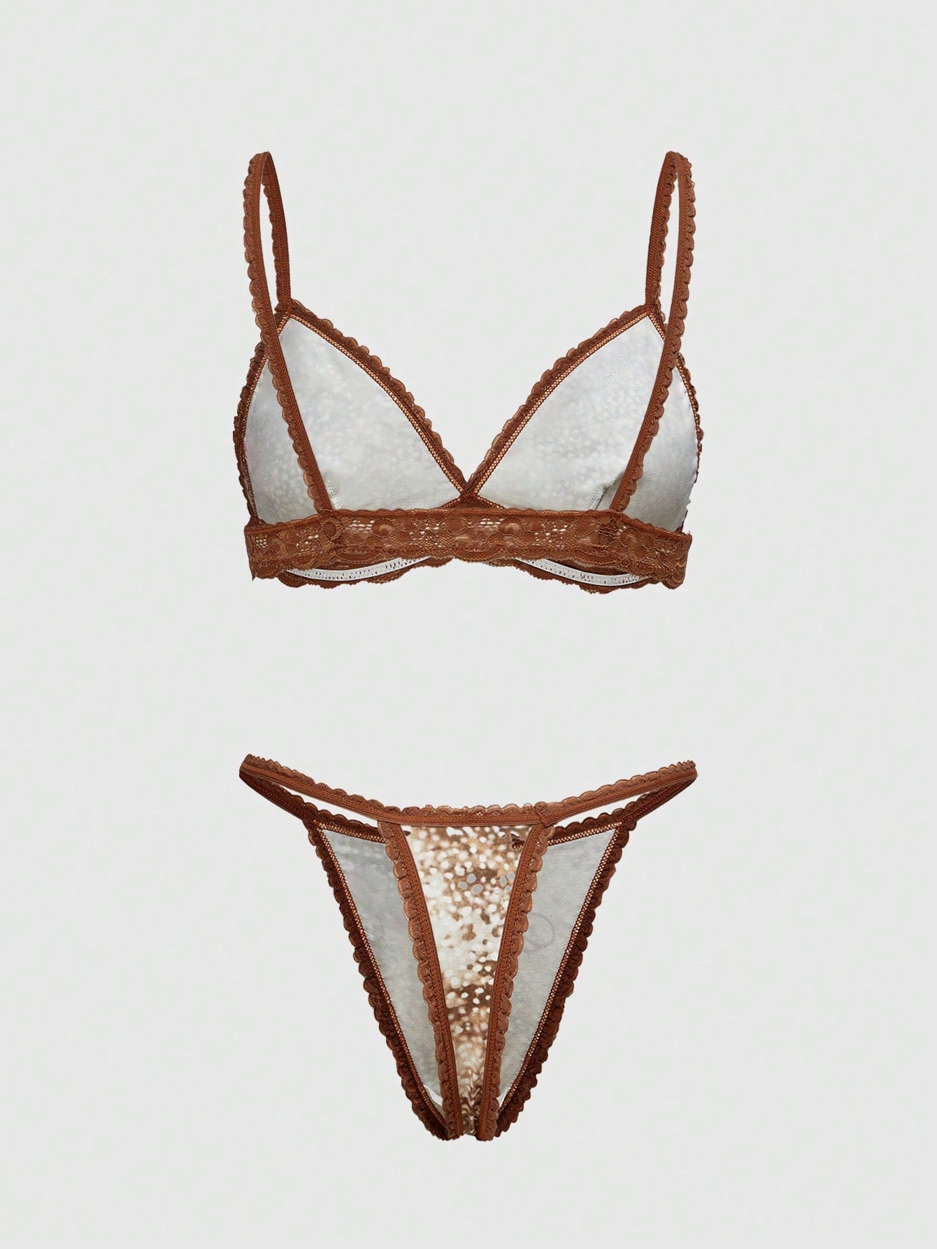 ROMWE Fairycore Conjunto de lencería inalámbrica con estampado de animal de ciervo de jardín de hadas, encaje y patchwork para mujeres