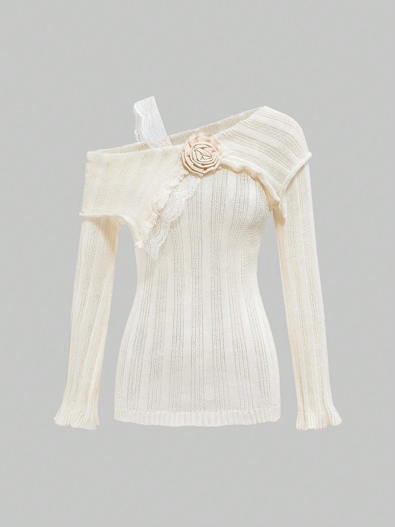 ROMWE Fairycore Jersey holgado transparente con mangas ajustadas de campana, cuello asimétrico y parches de encaje con estilo retro Y2K para mujer