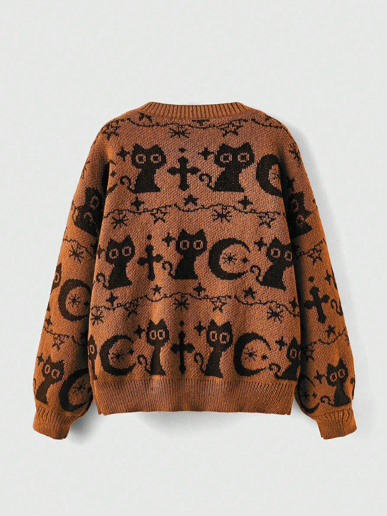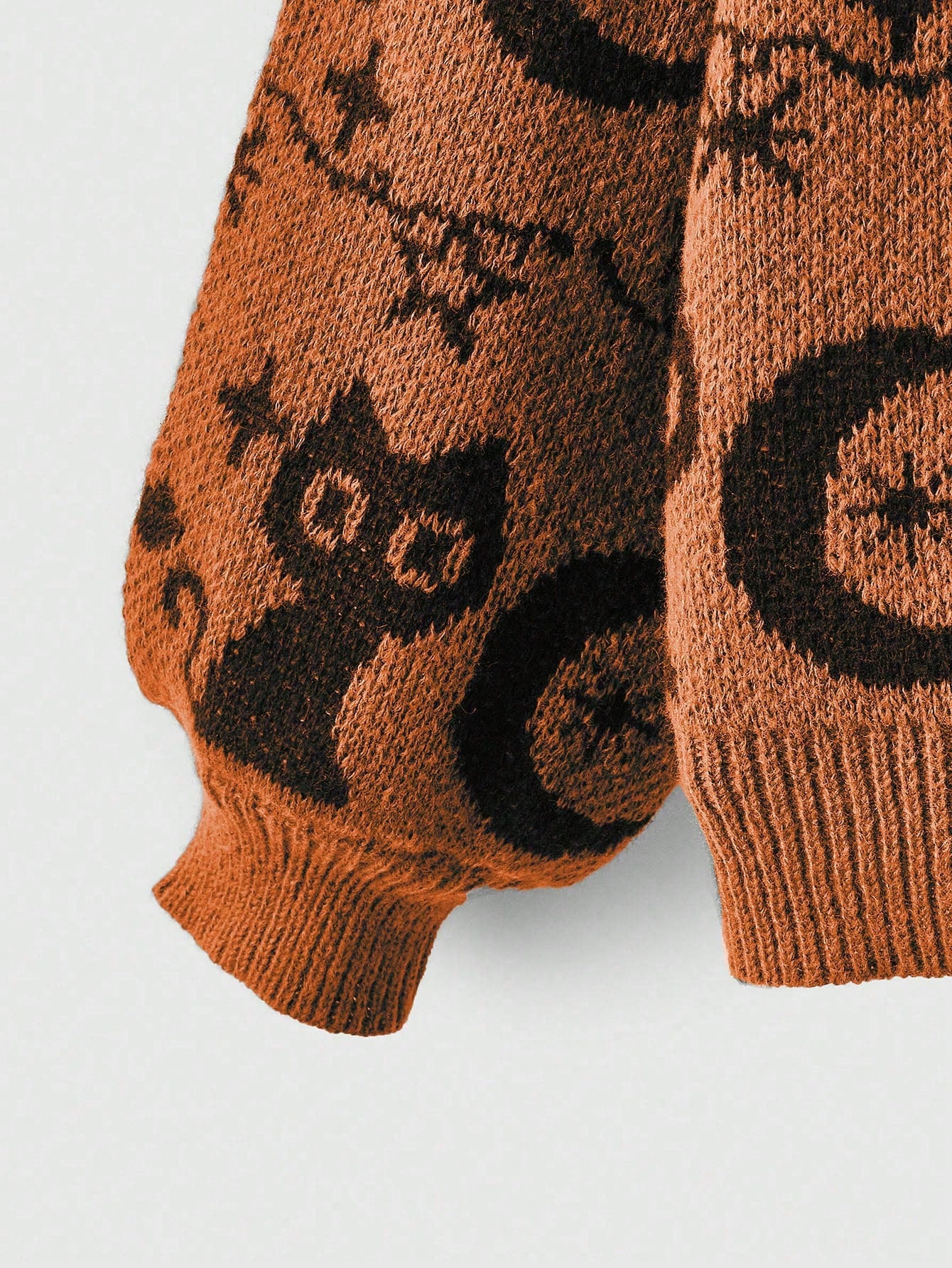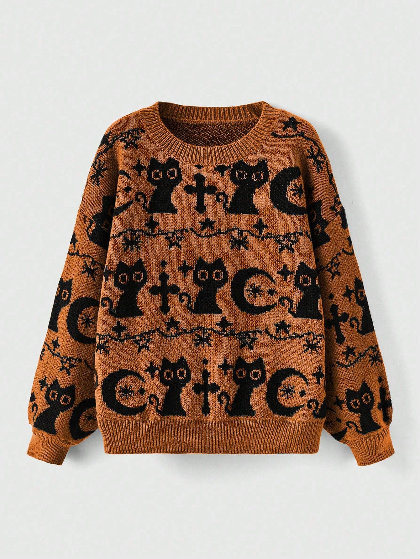 ROMWE Goth Suéter de cuello redondo con gato negro para Halloween