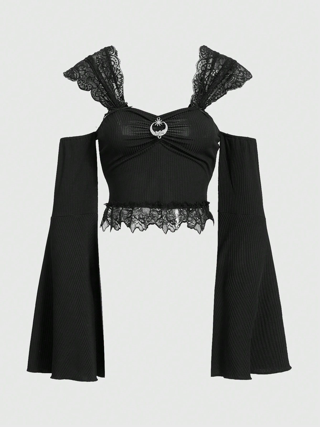 ROMWE Goth Top Gótico Sexy De Manga Acampanada Con Hombros Descubiertos Y Ribete De Encaje Para Mujer Con Adornos Metálicos De Estrella Y Luna