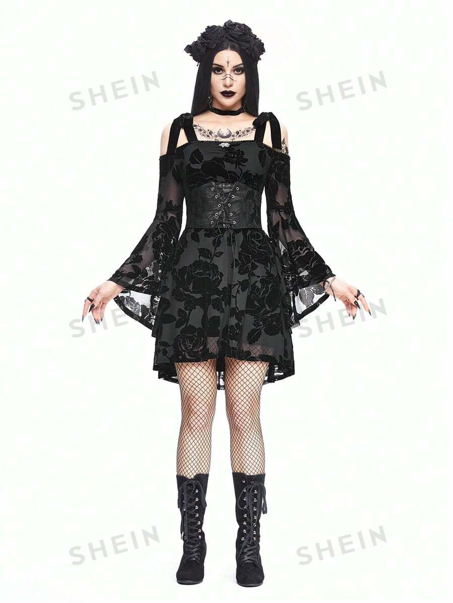ROMWE Goth Vestido de oscilación esponjoso con estampado botánico y diseño fuera del hombro para mujer, con colgante de serpiente y mangas acampanadas
