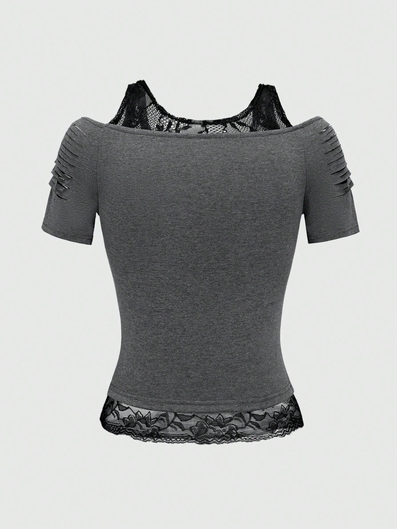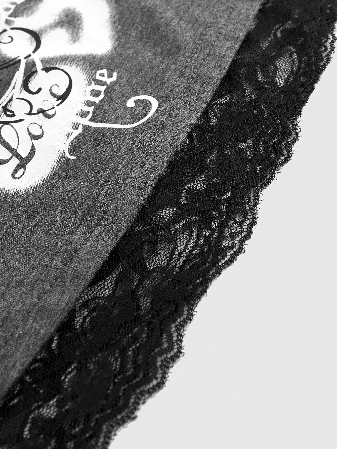 ROMWE Grunge Punk Camiseta con contraste de gráfico de letra, hombros descubiertos de encaje, para la escuela