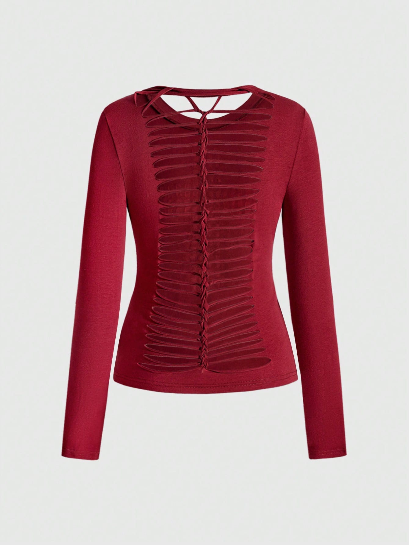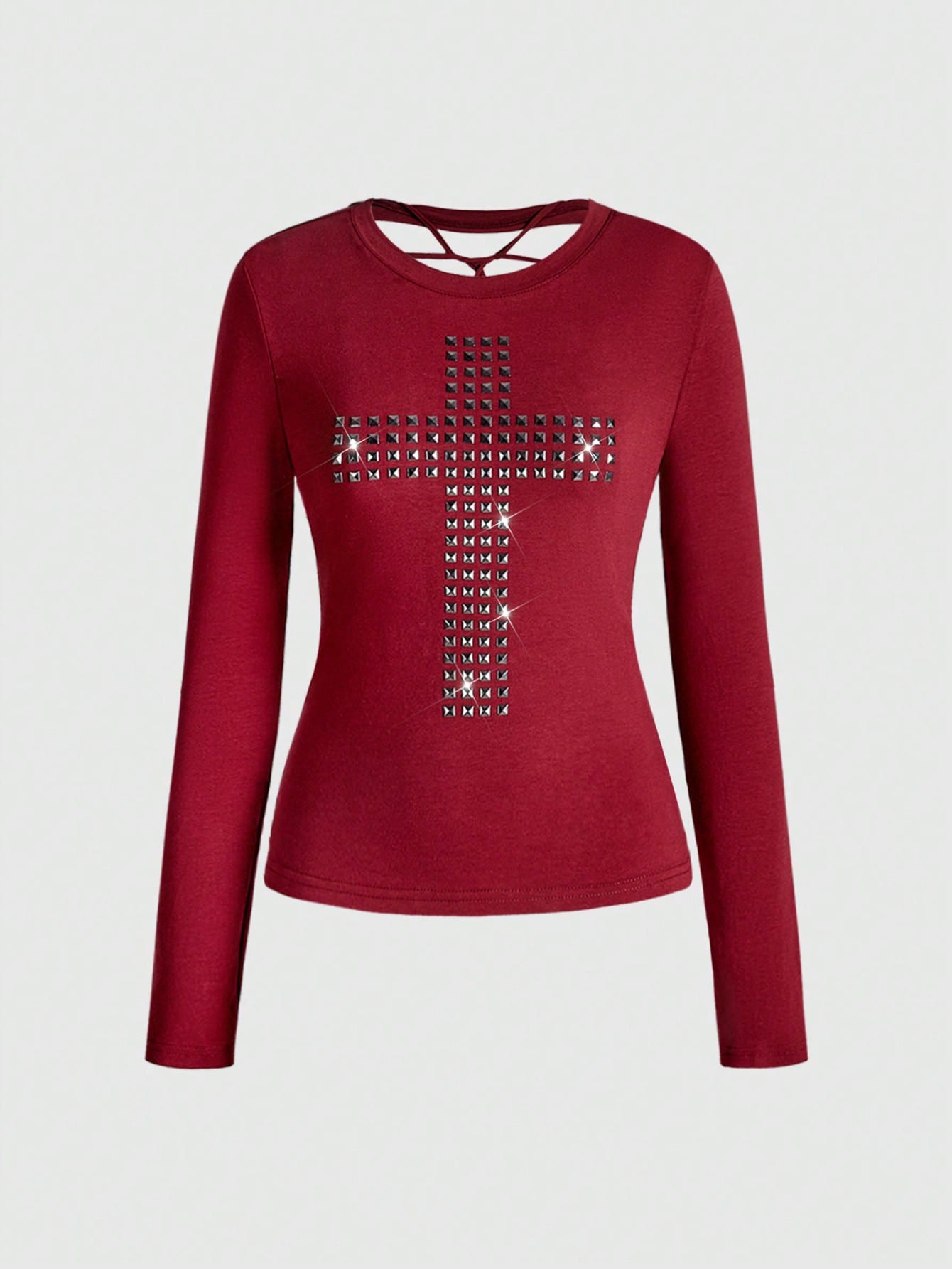 ROMWE Grunge Punk Camiseta de manga larga de ajuste ceñido con diseño de cruz remachada, corte láser en la espalda, estilo punk Y2K, de unicolor y versátil