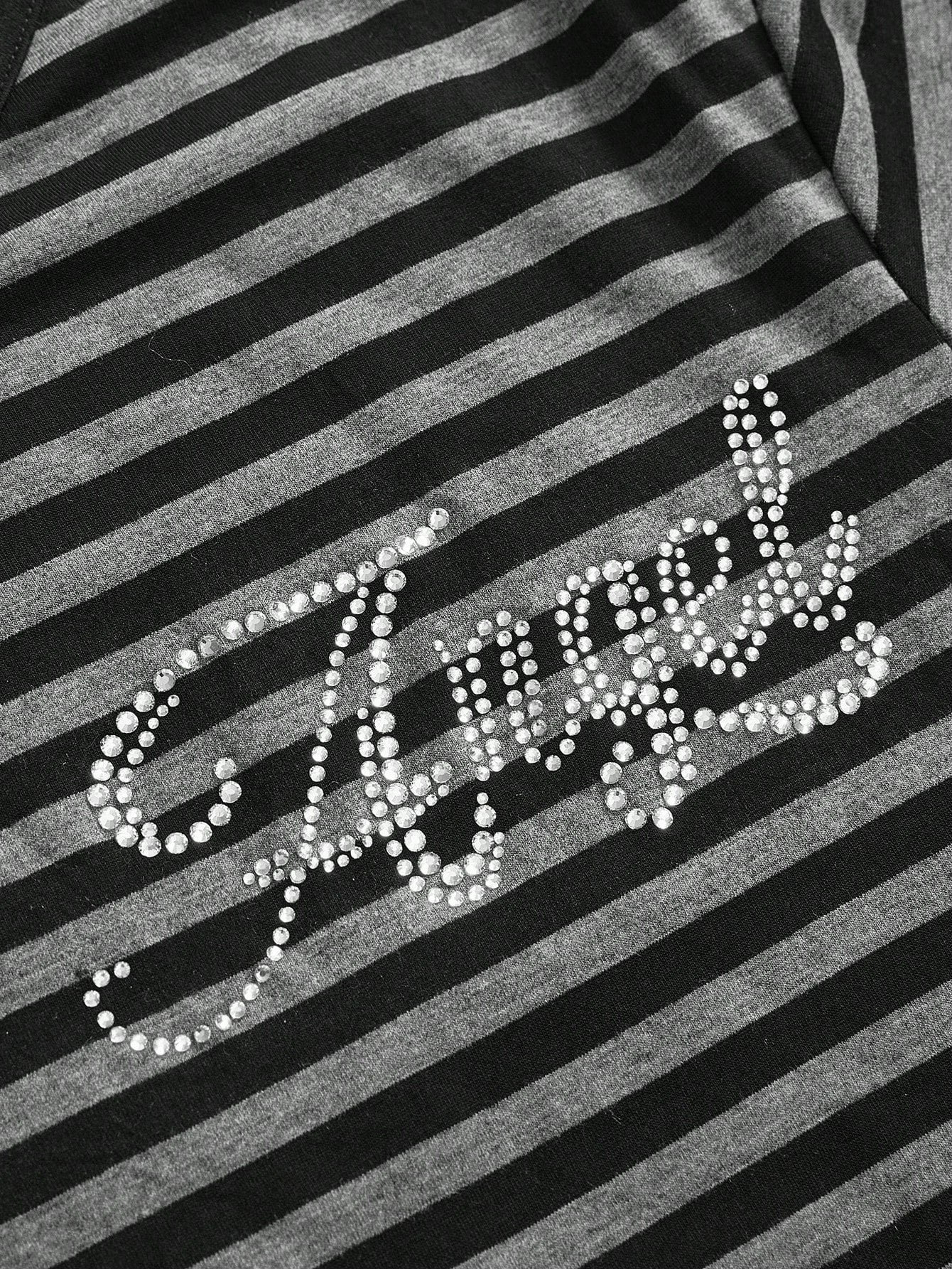 ROMWE Grunge Punk Camiseta de mujer suelta 2 en 1 con hombro oblicuo, rayas, letras y aplicación de strass en estilo dark punk