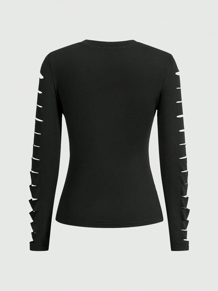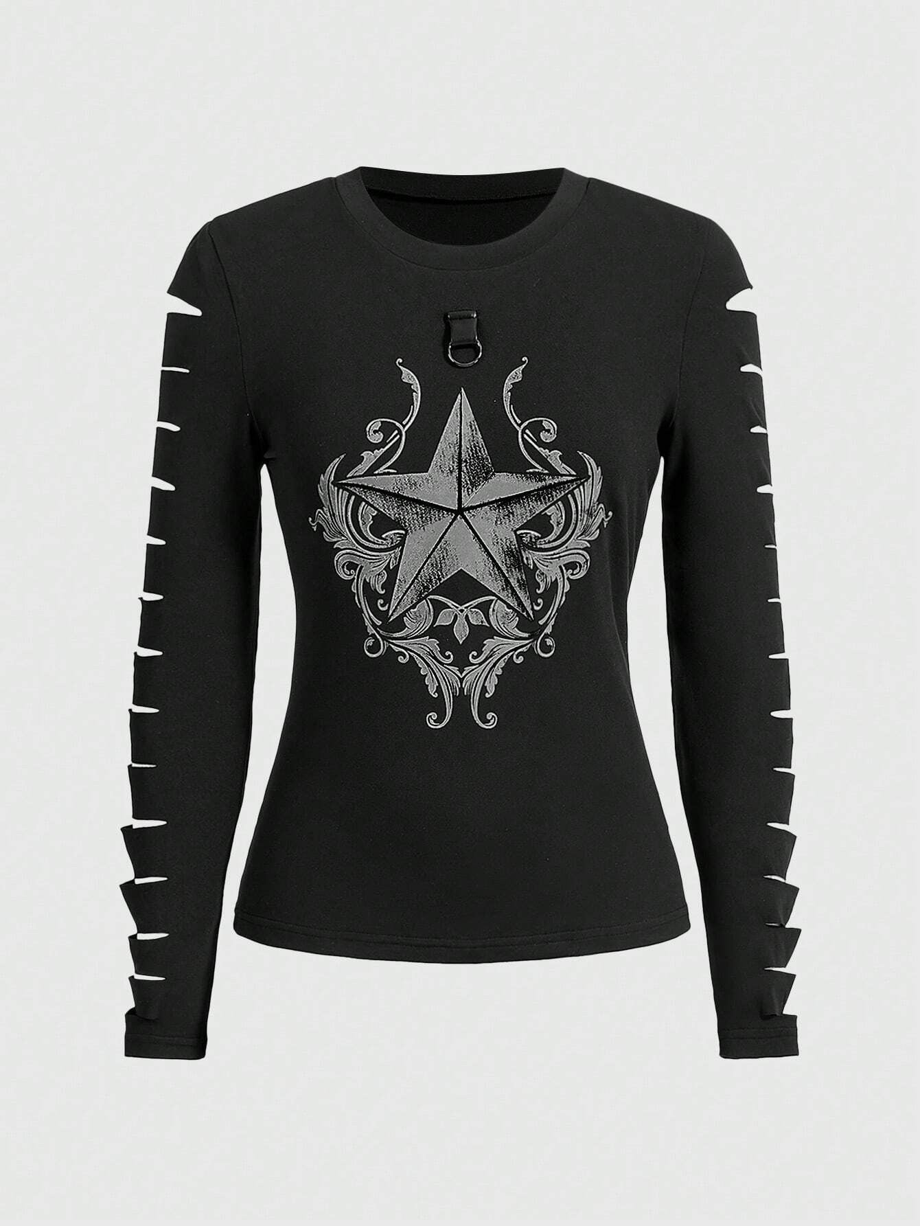 ROMWE Grunge Punk Mujer Camiseta De Manga Larga Con Estampado De Planta Y Paisaje Estrellado Y Mangas Desgastadas