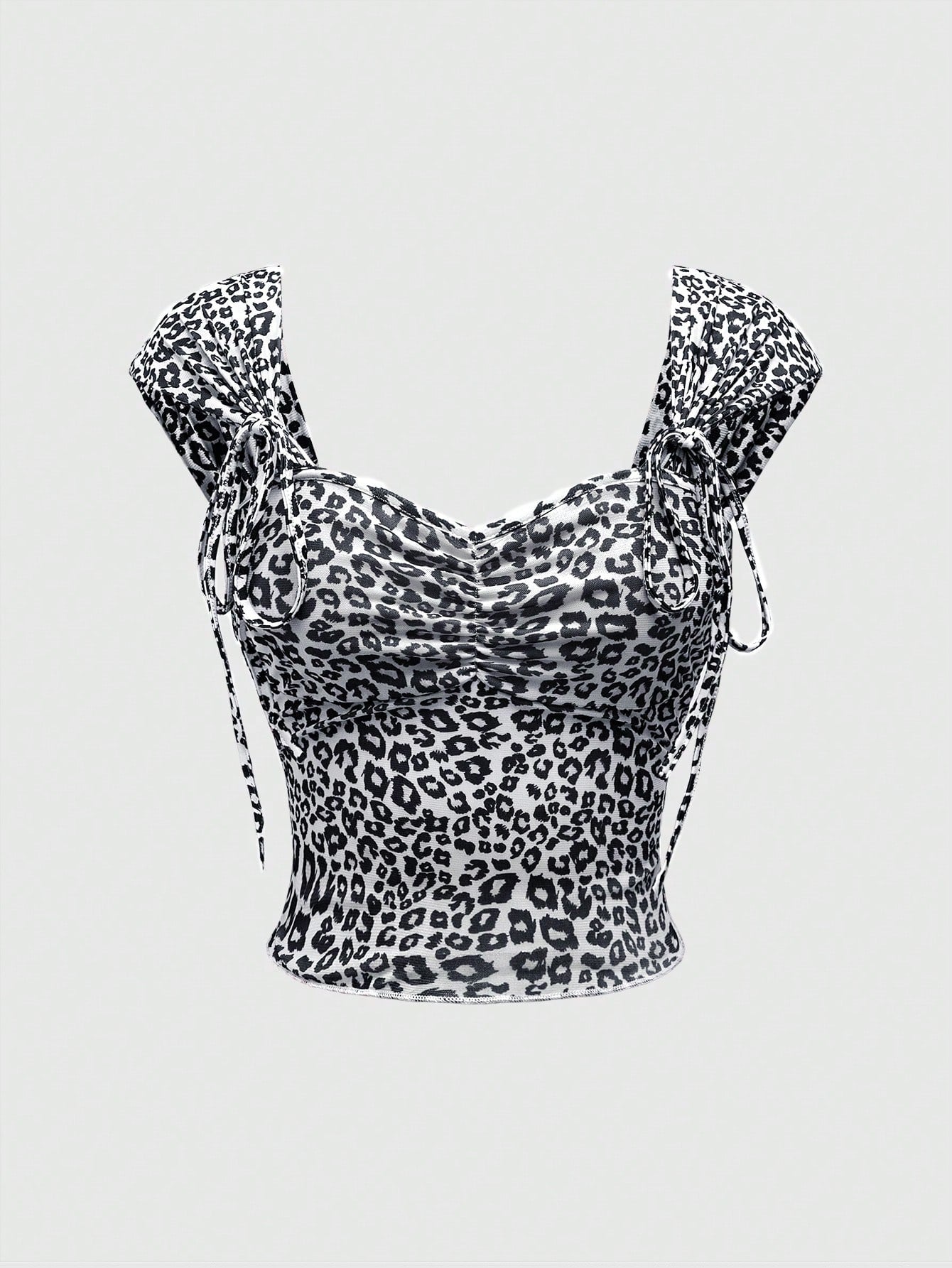 ROMWE J-Fashion Top de malla elástico ajustado con cuello de barco, lazo y estampado de leopardo sexy y de tendencia para mujeres maduras