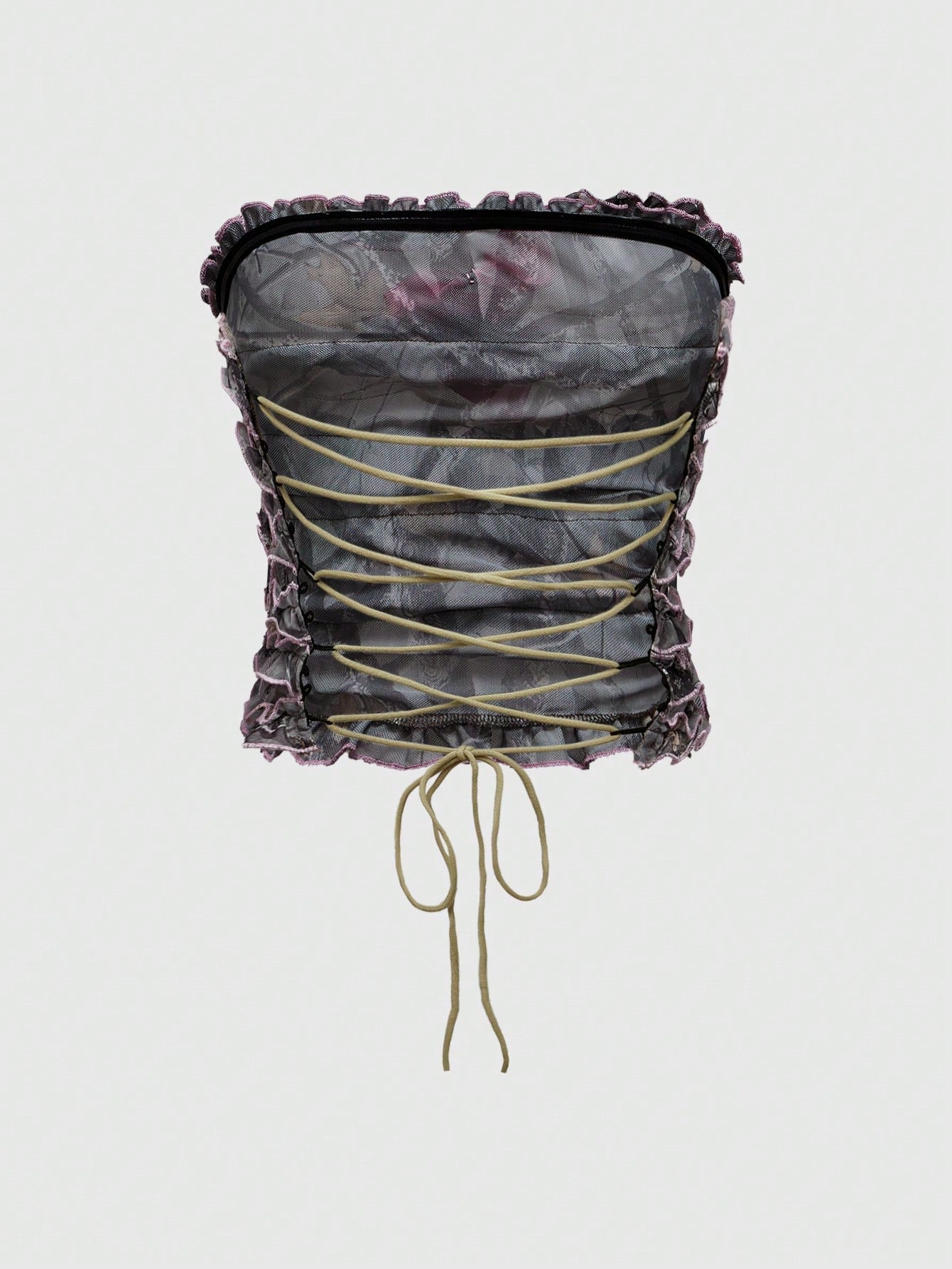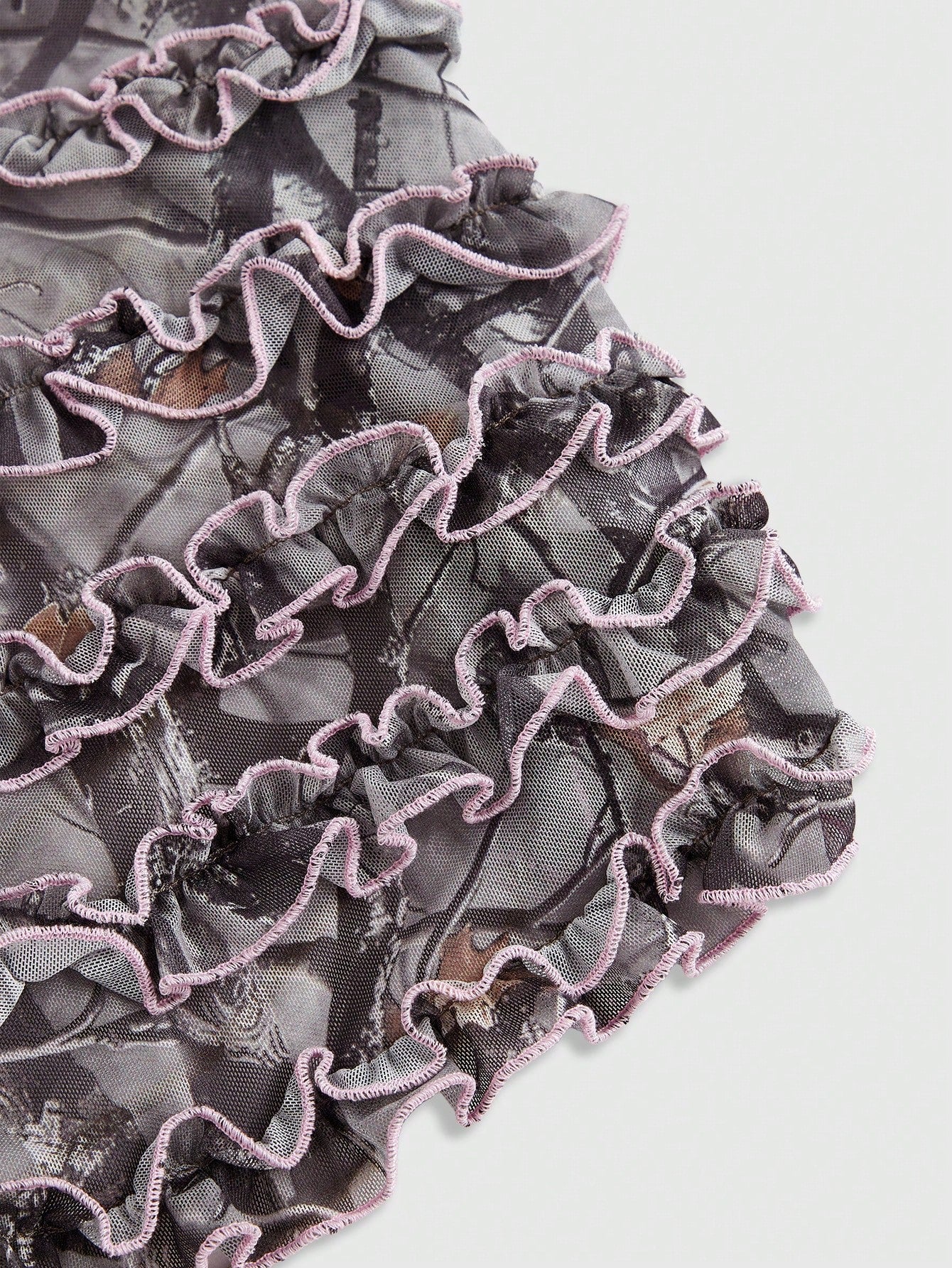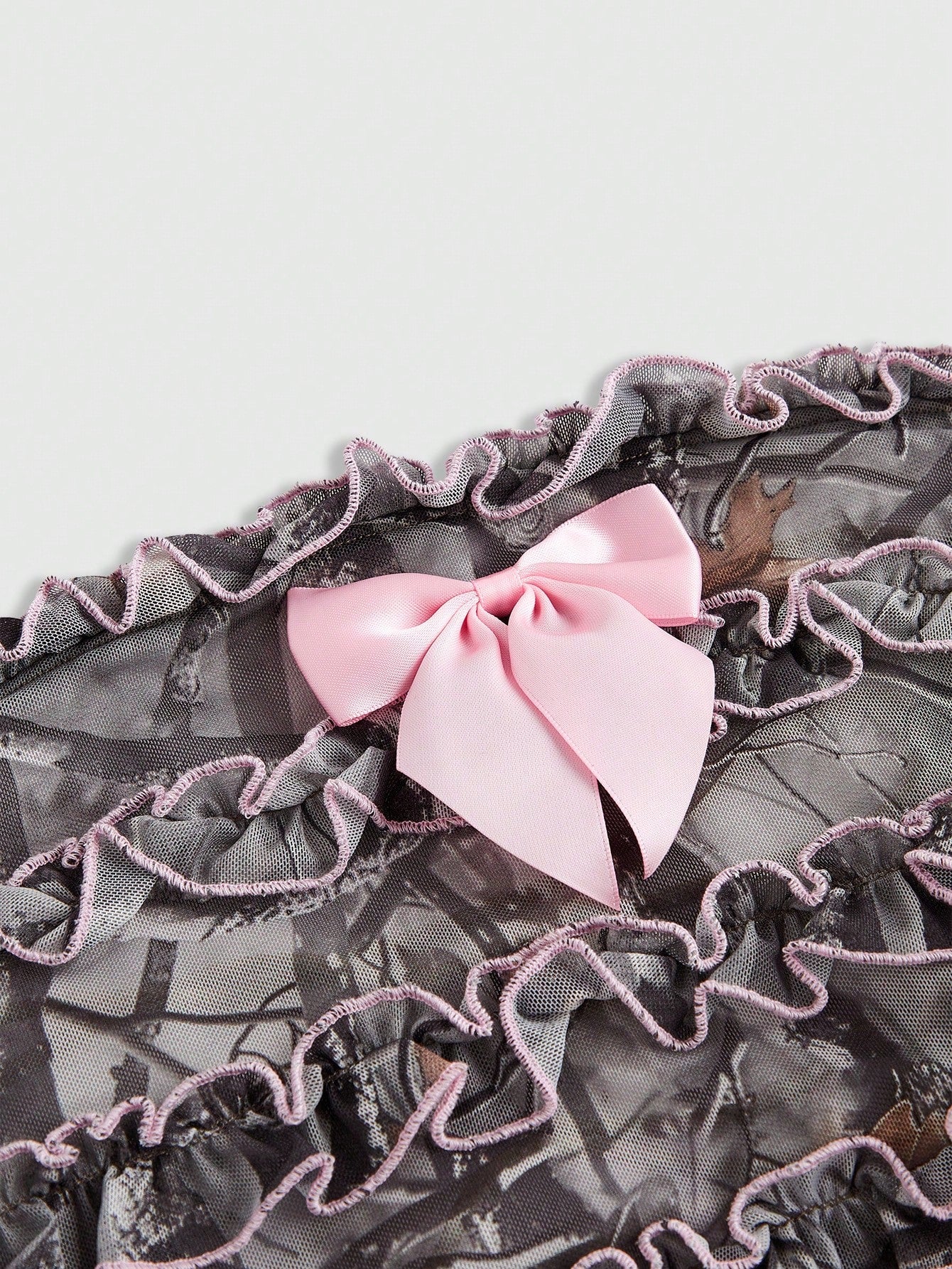 ROMWE Kawaii Blusa de tul con volantes y lazo rosa en estilo camuflaje Y2K para mujer