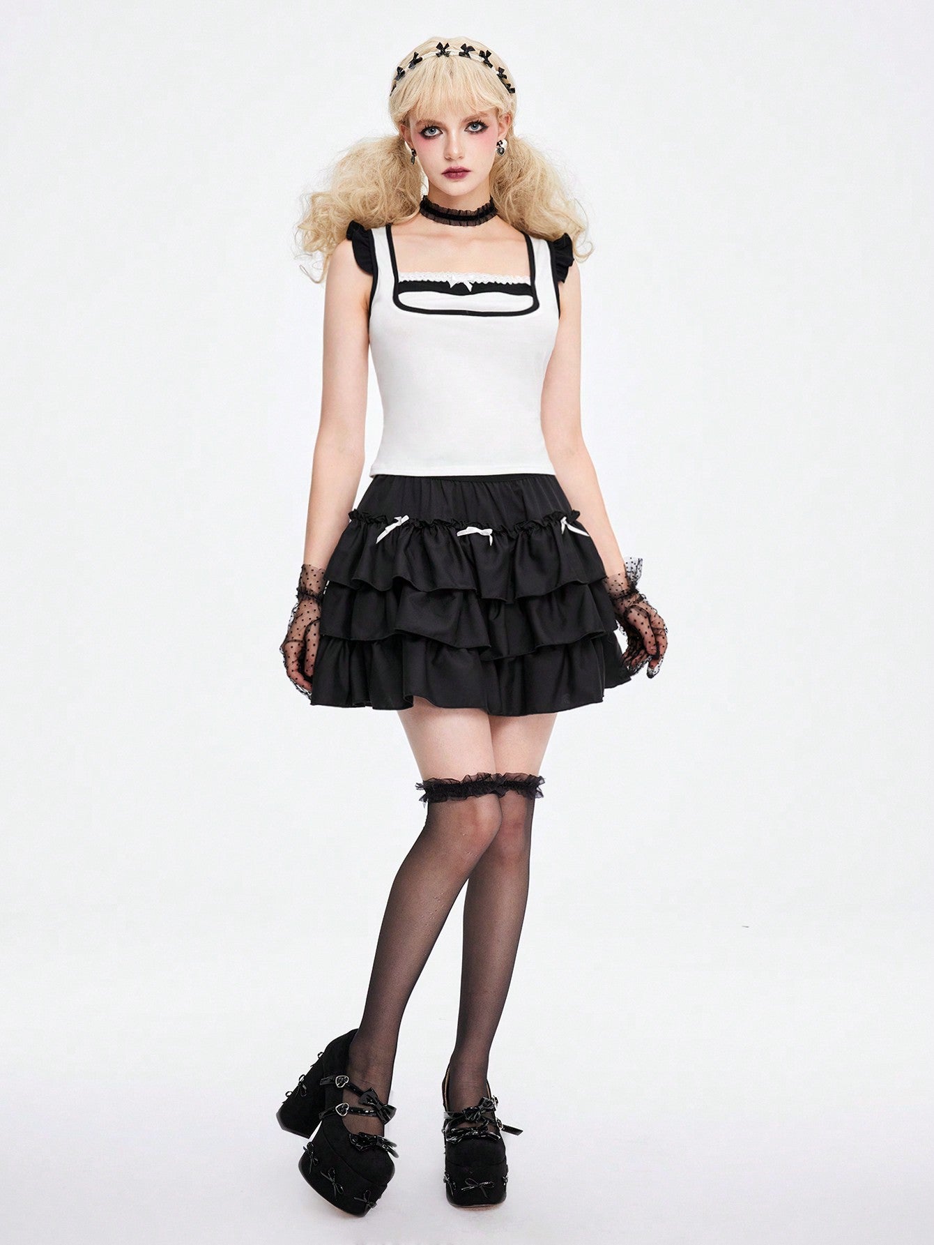 ROMWE Kawaii Camiseta casual de mujer de manga corta con cuello cuadrado decorado con lazo para el verano