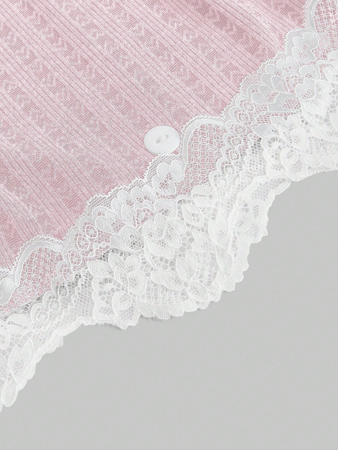 ROMWE Kawaii Camiseta de mujer ajustada con halter de encaje de contraste rosa en 2 en 1, estilo Himekaji