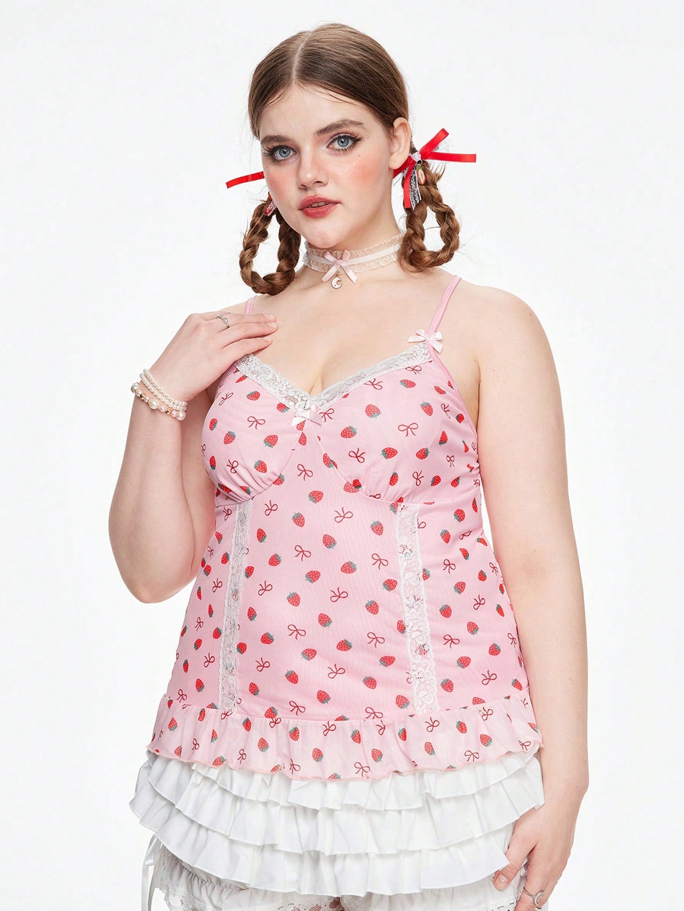 ROMWE Kawaii Camisola Con Empalme De Encaje Con Estampado De Fresas De Talla Grande