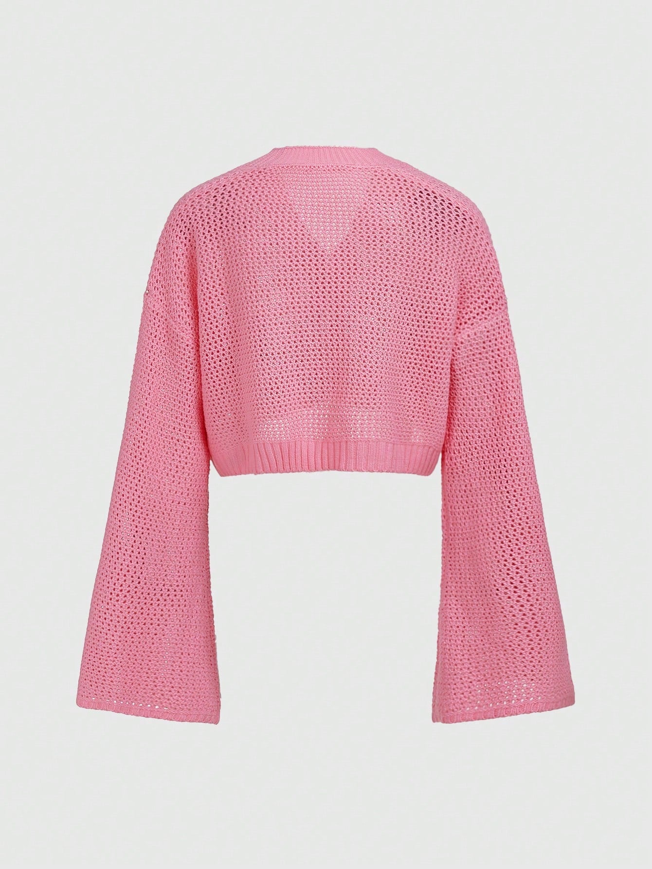 ROMWE Kawaii Cárdigan de mujer con bordado de gato de dibujos animados y mangas con campana, color rosa