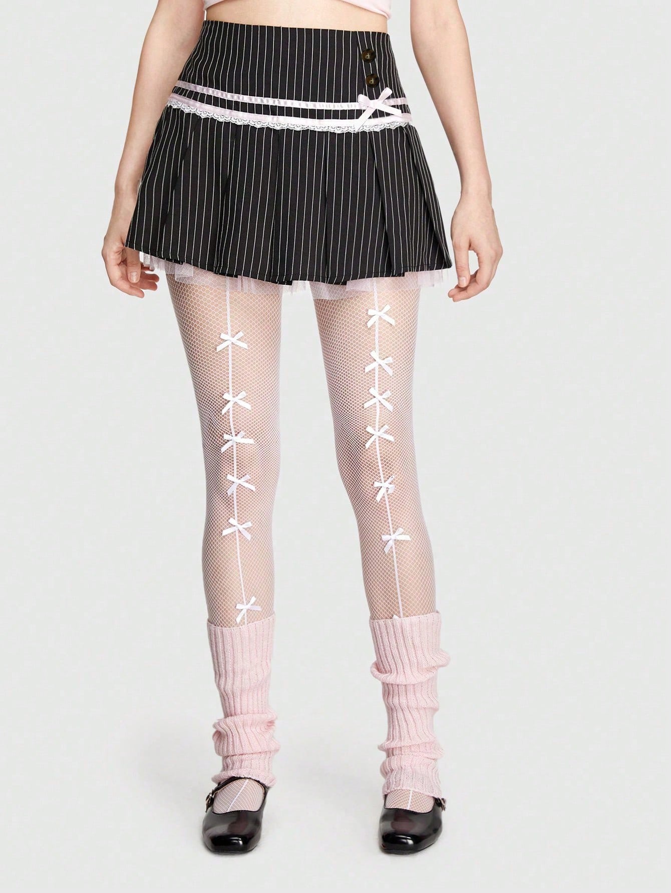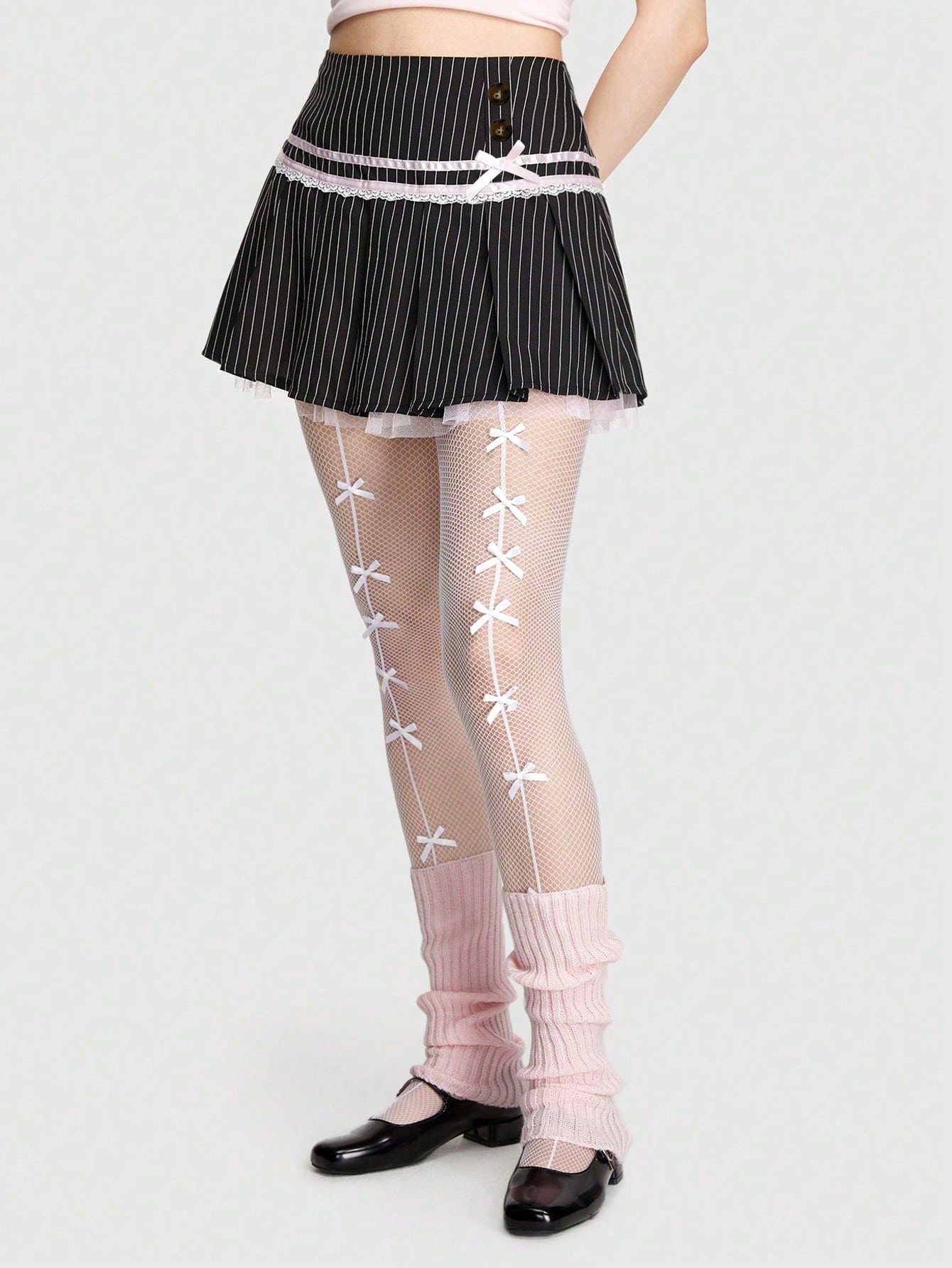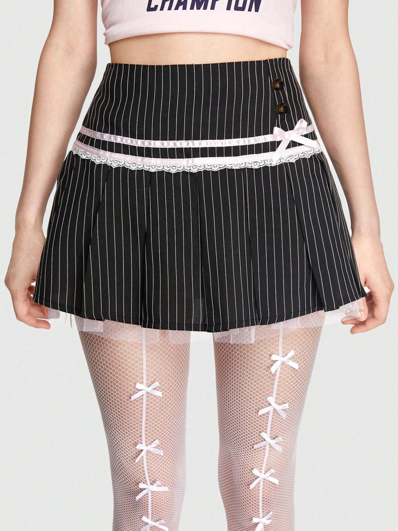 ROMWE Kawaii Falda Con Ribete De Encaje Y Rayas Decorado Con Un Nudo De Lazo