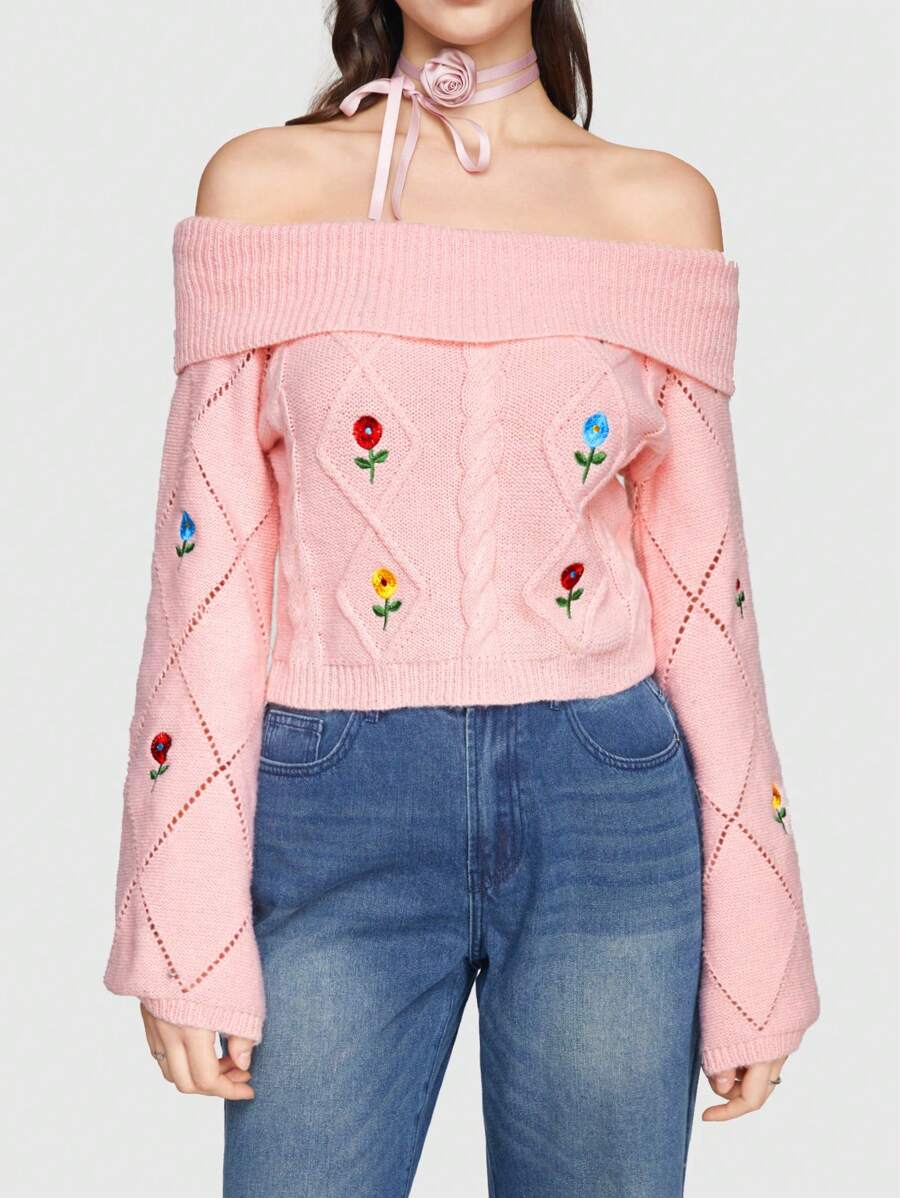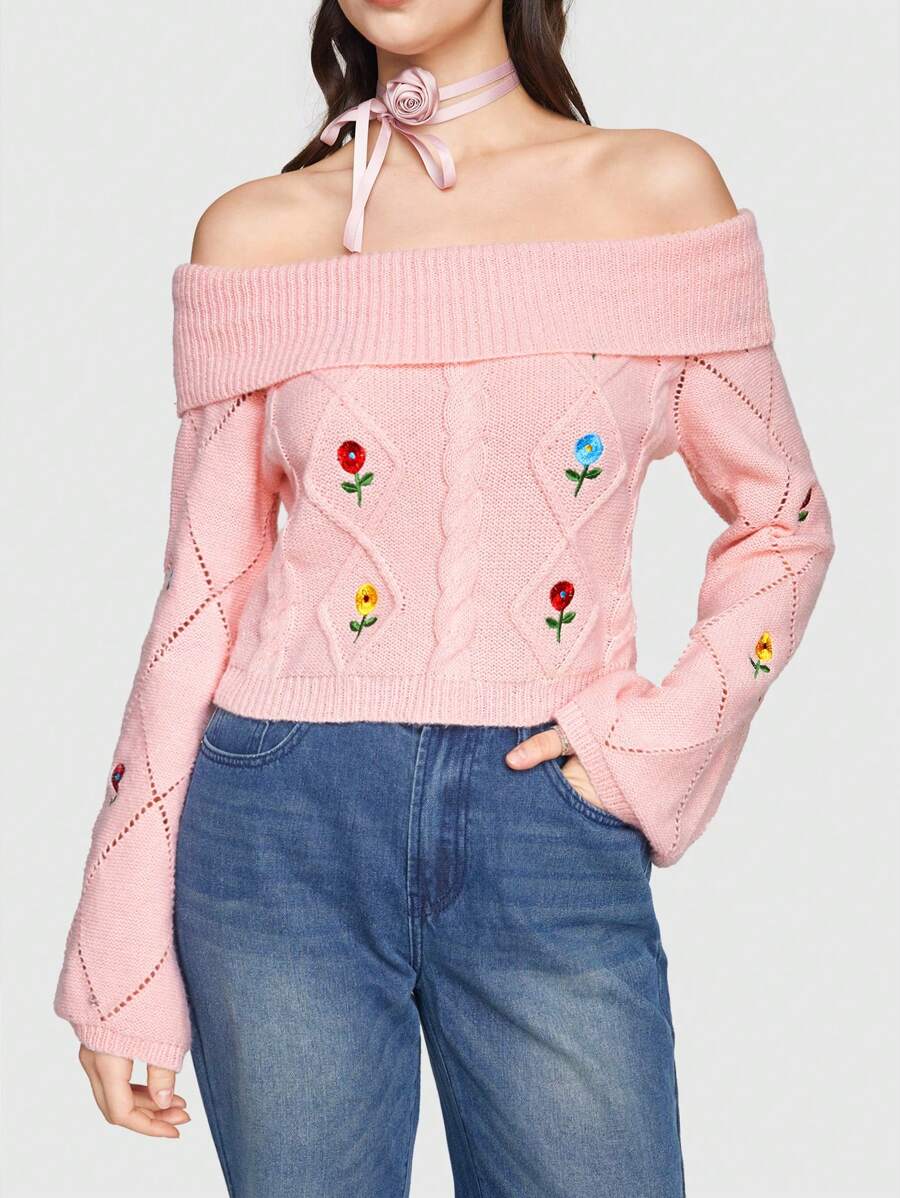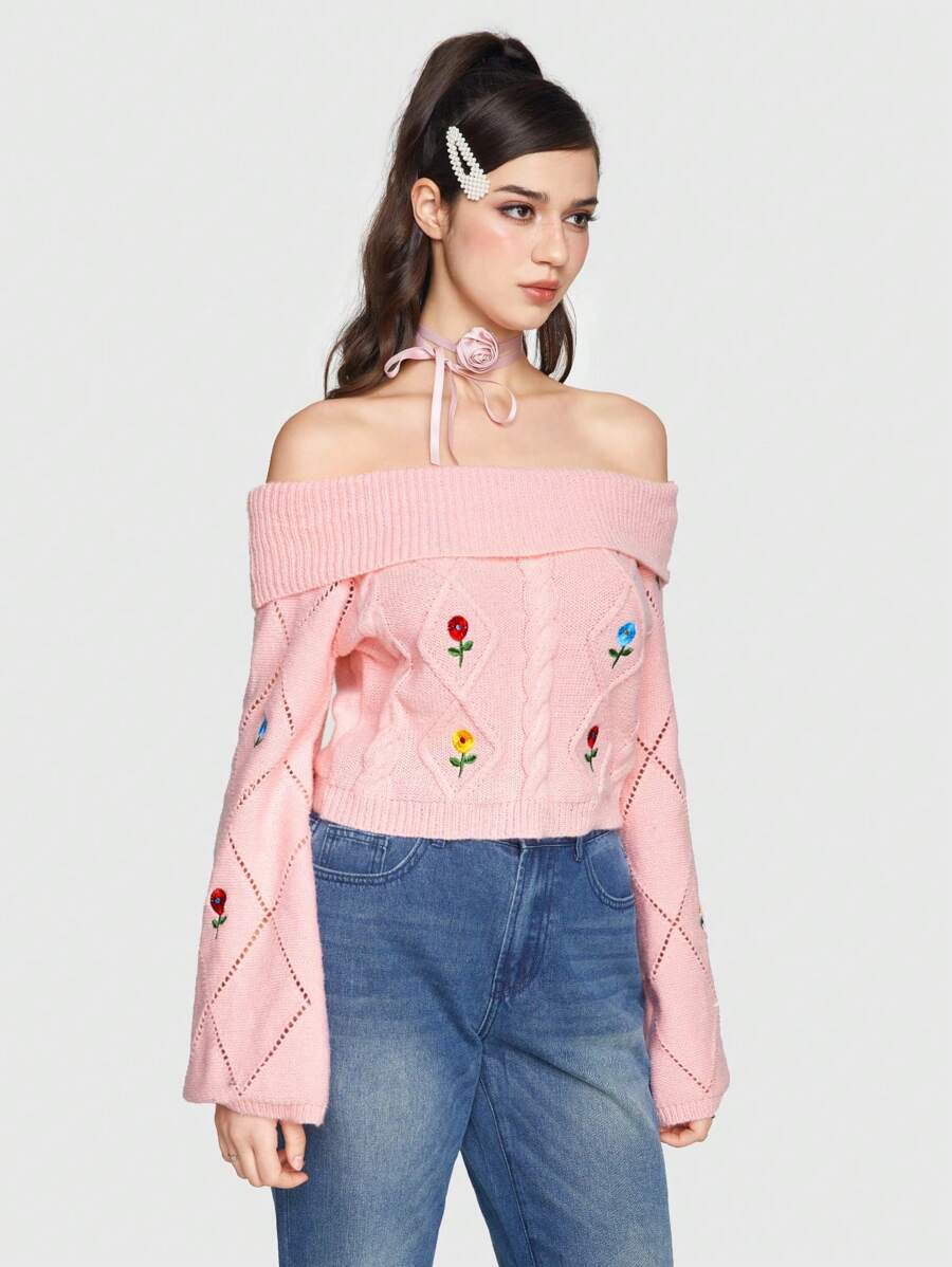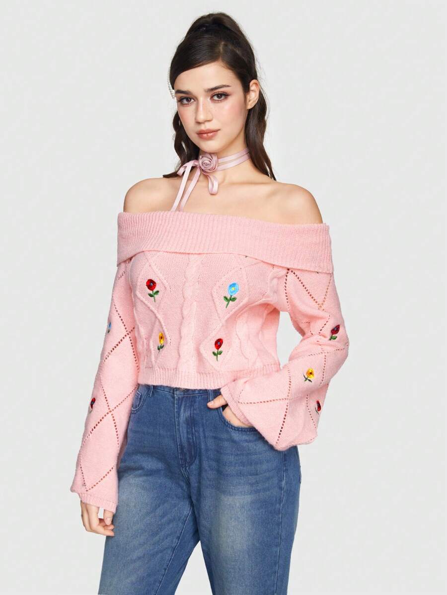 ROMWE Kawaii Lindo Suéter Floral Bordado Con Hombros Descubiertos Para Mujer